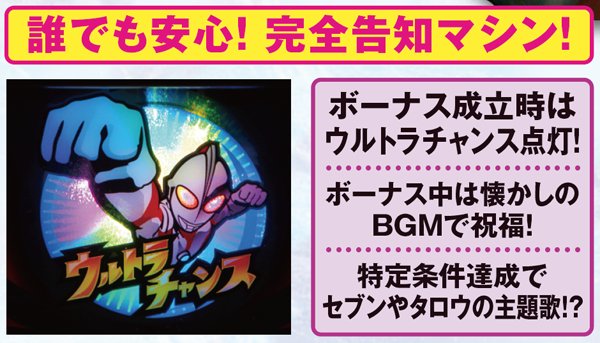 | 機種概要 | 七匠の『パチスロ ウルトラマン』は、336枚獲得できるビッグと130枚増のREGで出玉増加を目指すマシン。ウルトラチャンスが光れば漏れなくボーナス確定となる完全告知機なので、打ち手を選ばず、誰でも簡単に楽しめるのも魅力の一つとして挙げられる。 |