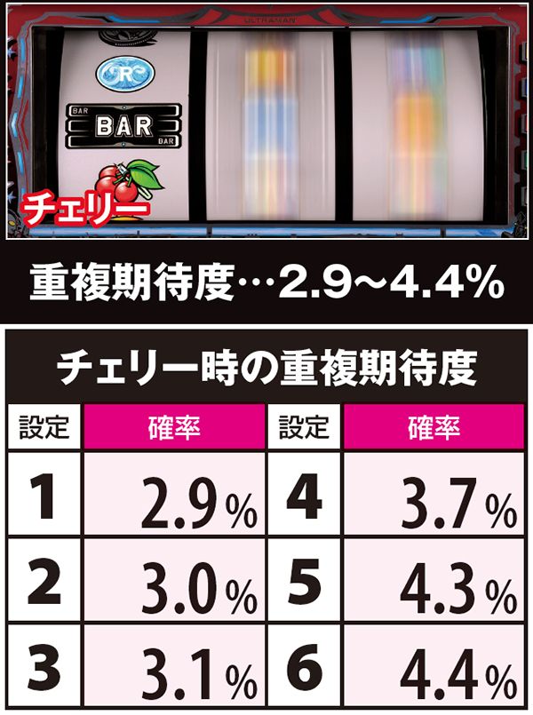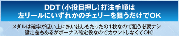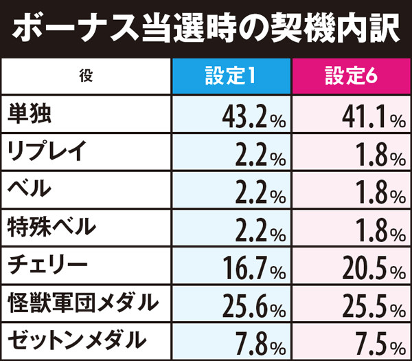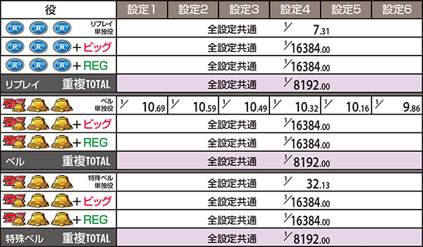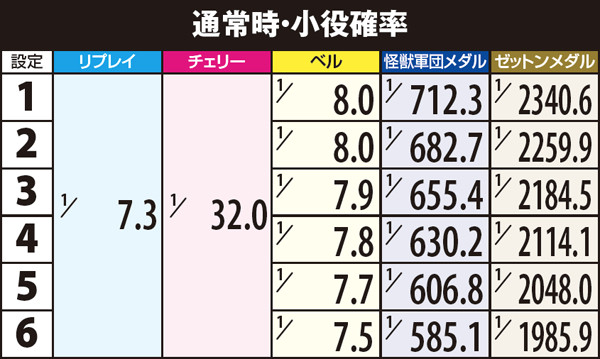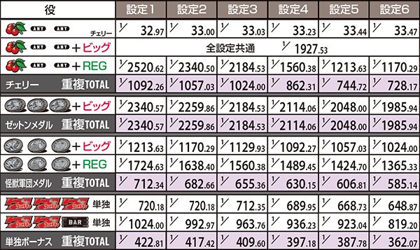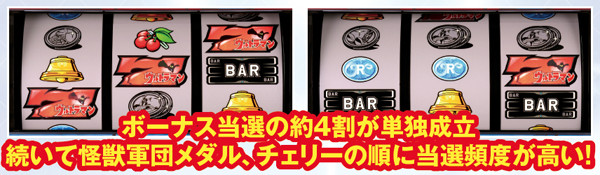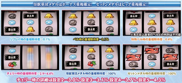ボーナスは全ての小役と同時成立する可能性があり、各種メダルはボーナス重複確定。入賞させるためにはシビアな目押しを要するが、成立フラグを取りこぼしても払い出しのない形でメダルが3つ並ぶので、各種メダル重複は見抜くことができる。なお、チェリー重複のみ設定に準じて割合が高まる仕組みだ。