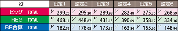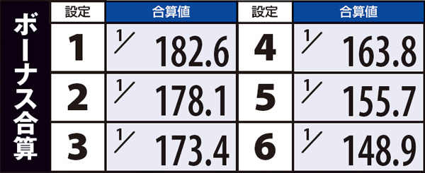 ・ボーナス合算1/182.6(設定1)~1/148.9(設定6)