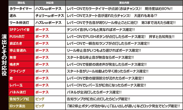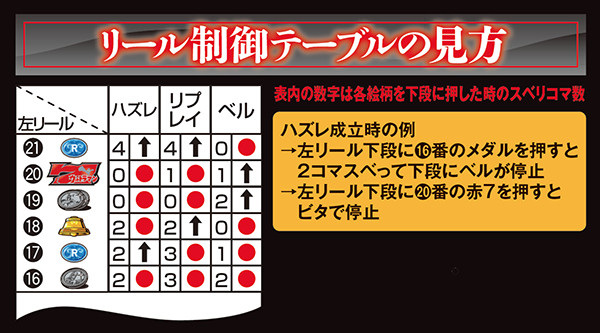 本機は中リール上段に赤7絵柄を狙い、そのまま停止した場合はボーナスが確定する。また、中段停止時はチェリーorボーナスで、基本的にはベルorハズレとなる下段停止からのボーナス成立パターンもある。レバーONで予告音が発生した際は、中リールから狙ってみるのも一興だろう。
