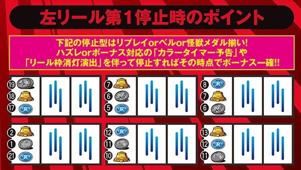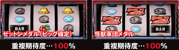 ボーナスは全小役と重複する可能性アリ。2種類あるメダルを取りこぼした際は払い出しのない形でメダルが3つ並ぶので、メダル重複も完璧に見抜くことができる。