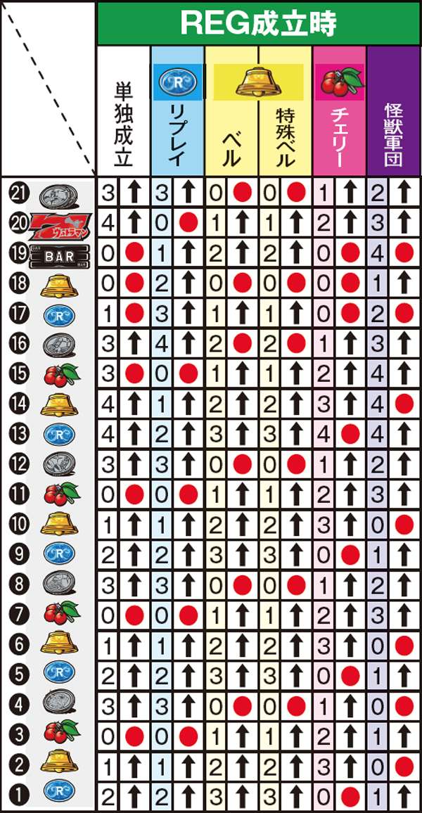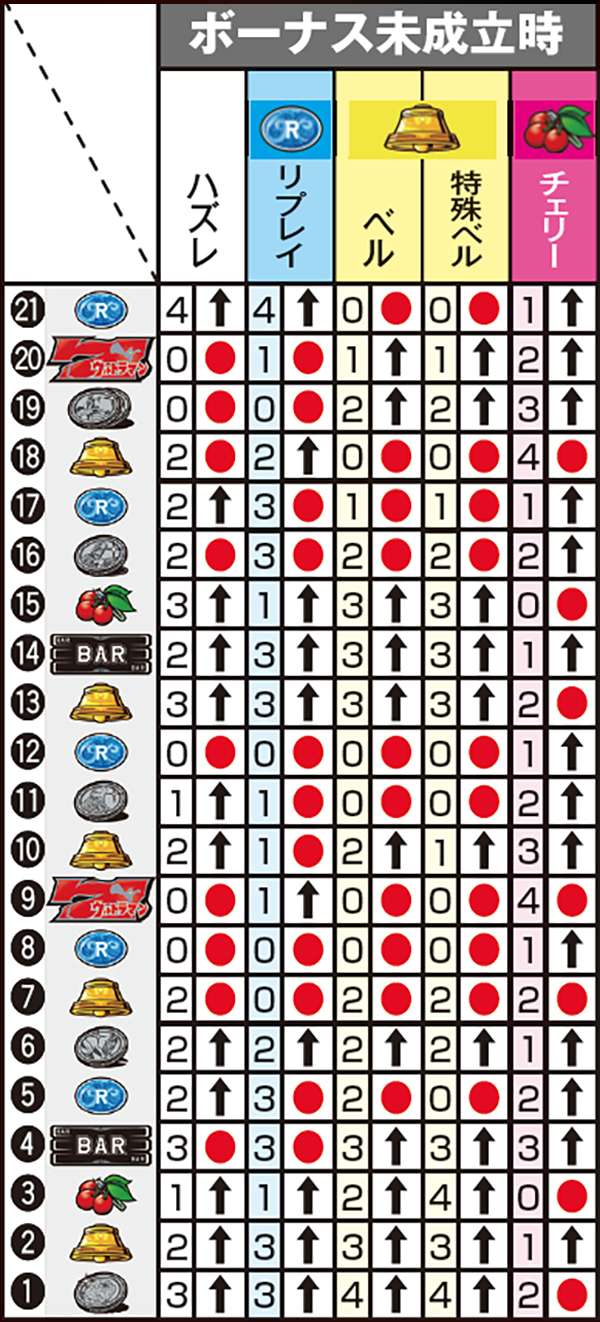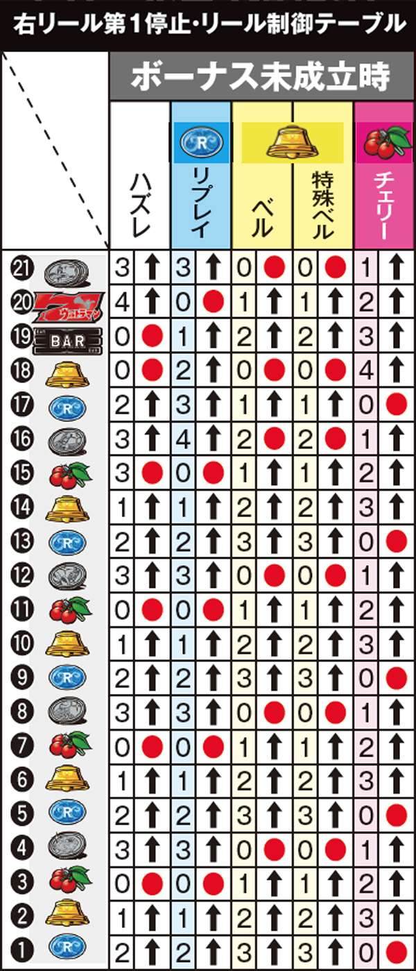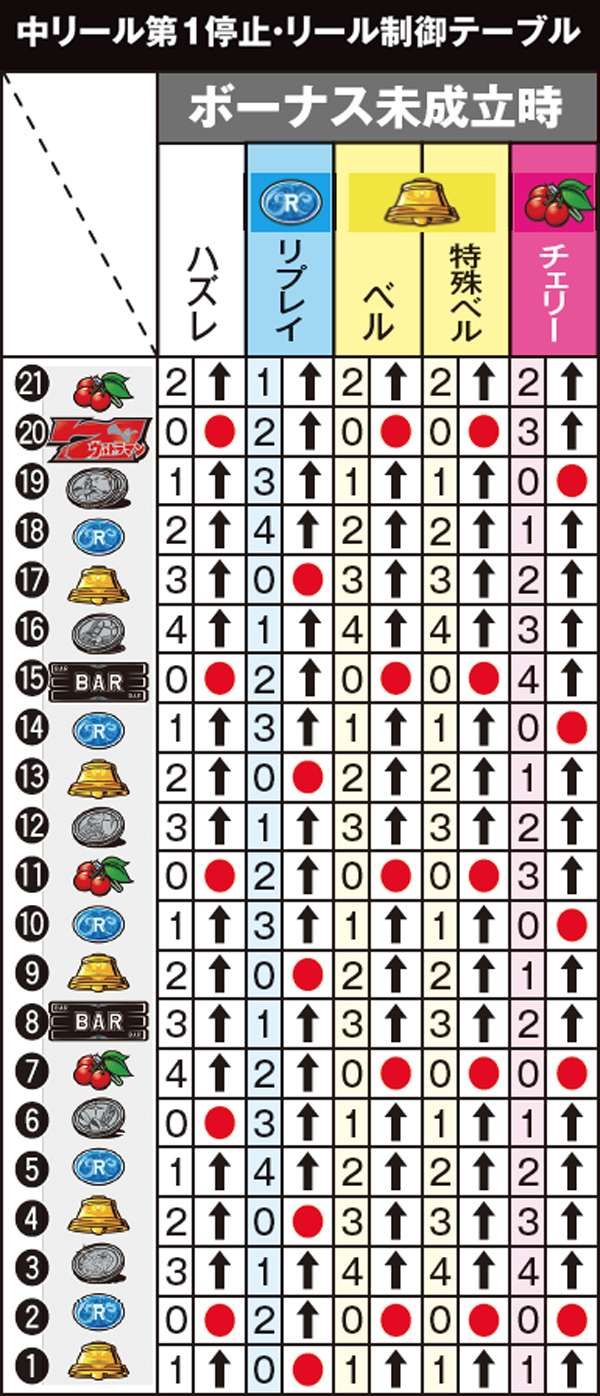 リール制御テーブル表は、各フラグの成立時に左下段に停止する位置を●で示している(↑は通過の意味)。横の数字はその位置で押した場合のスベリコマ数を示す。