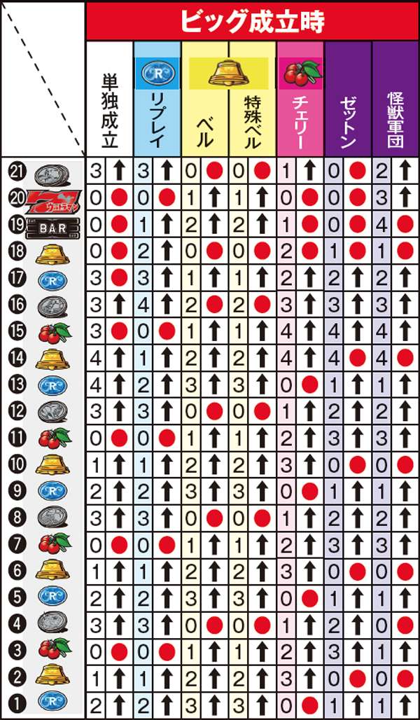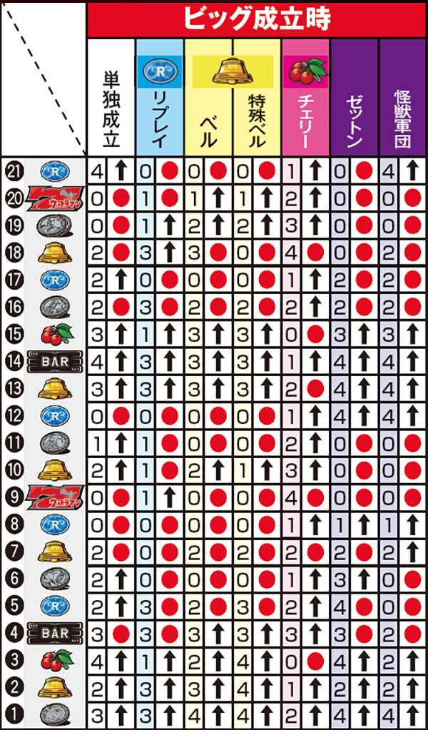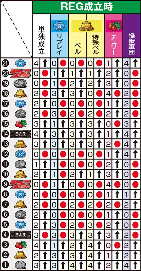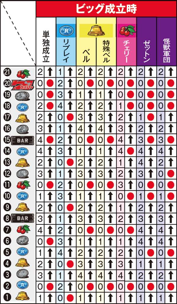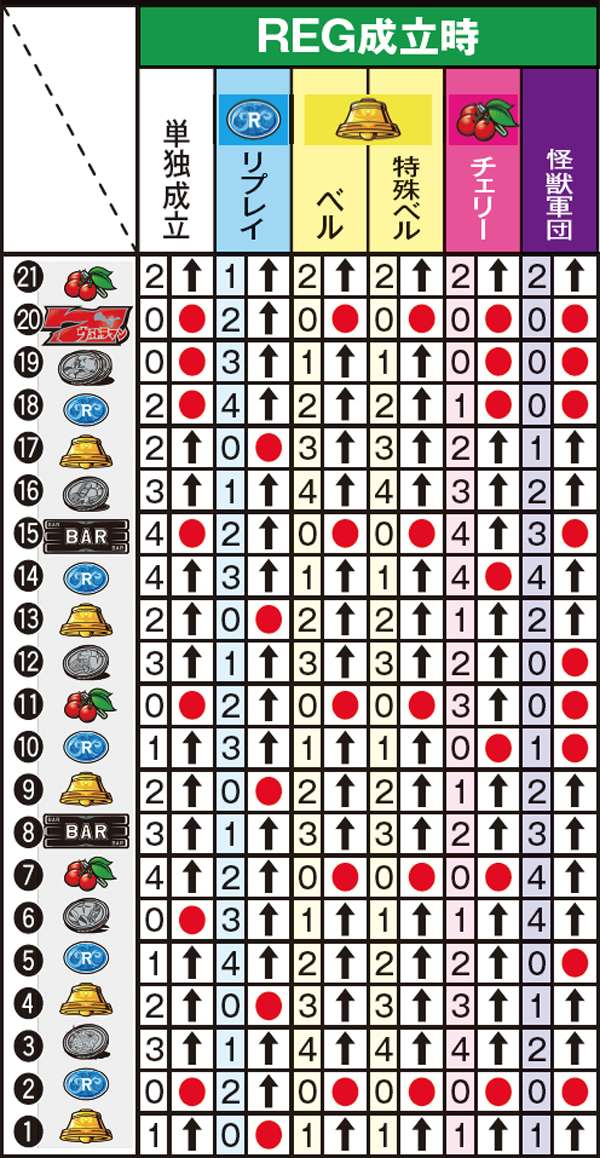 リール制御テーブル表は、各フラグの成立時に左下段に停止する位置を●で示している(↑は通過の意味)。横の数字はその位置で押した場合のスベリコマ数を示す。