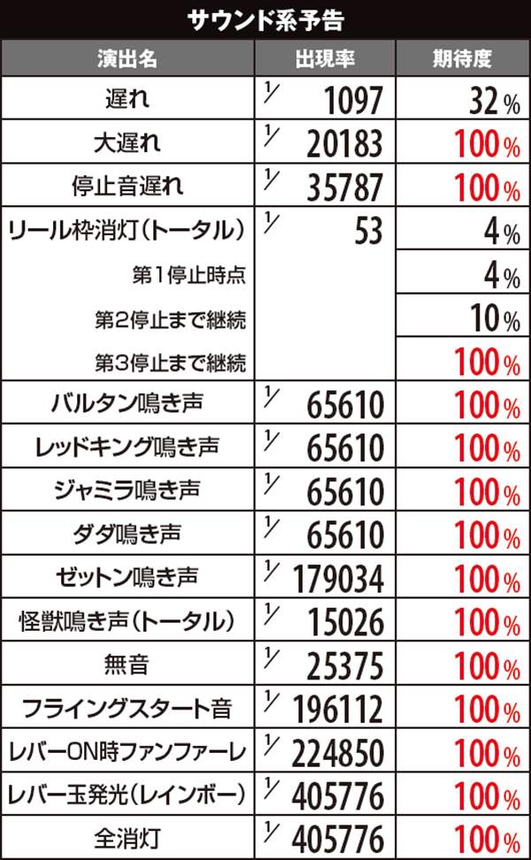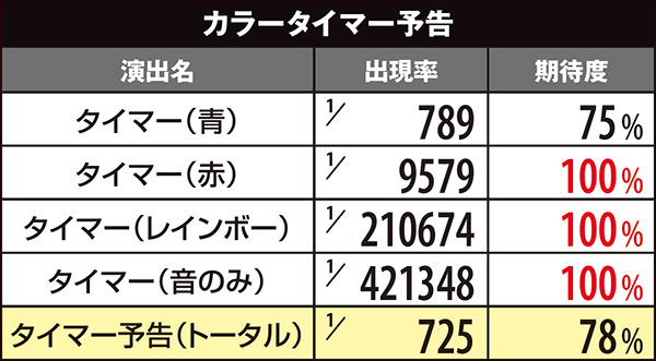 激アツのカラータイマーは期待度約80%。遅れは通常と大遅れの2つがあるようで、もちろん後者の方がアツい。また、リール枠消灯は第3停止まで発展でボーナス確定。多数の違和感演出も打ち手を大いに盛り上げてくれる。