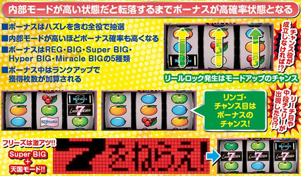 チャンス目、チェリー、リンゴに関しては「ボーナス期待度」と「モードアップ期待度」に差があり、前者はチェリー<リンゴ<チャンス目、後者はチャンス目<チェリー<リンゴの順に期待度アップとなる。リーチ目は確定だ。
