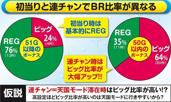 実戦では、初当りは7割以上がREGだったが、連チャン中は6割以上がビッグ。恐らく、連チャン(推定天国モード)中はビッグ比率がアップしているのだと思われる。高設定ほどビッグ確率が高いということは、初当りよりも連チャンの方に設定差が設けられている可能性が高い。