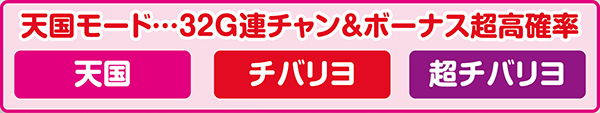 全8種類のモードでボーナス当選率を管理しており、天国モード以上であれば32G以内のボーナス連チャン確定となる。