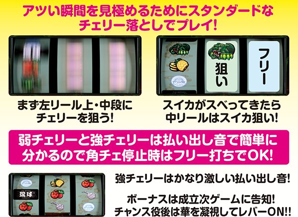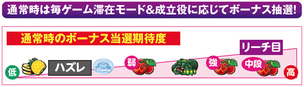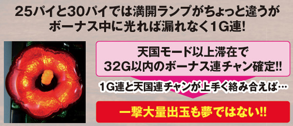 通常時は毎ゲーム滞在モード&成立役別にボーナス抽選を行っており、ハズレやリプレイよりチャンス役の方がボーナス当選率が優遇されている。天国モード滞在時は31Gまでに華が光らずとも32G到達で光る可能性大。ボーナス後32Gは絶対に打とう。