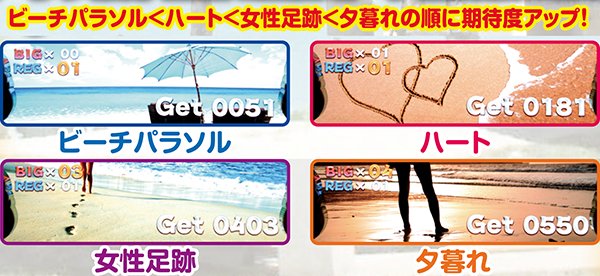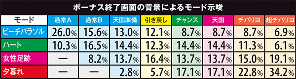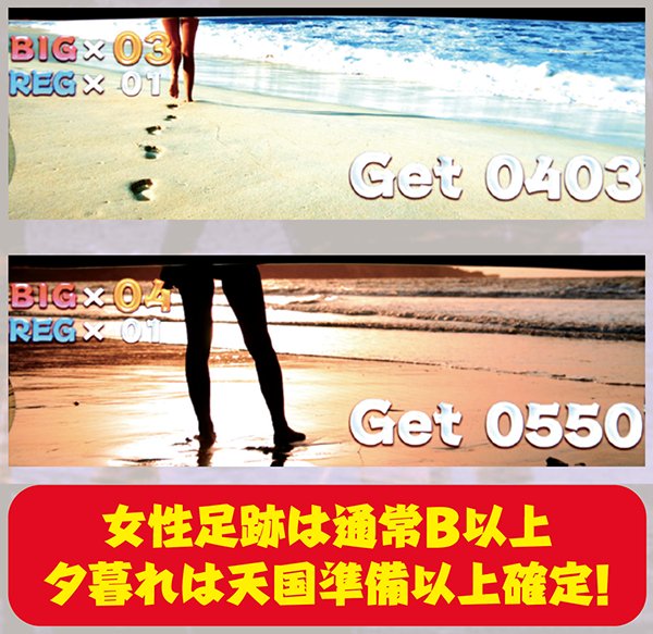 ボーナス終了画面の女性足跡は通常B以上、夕暮れは天国準備以上確定となるので見落とし厳禁。もし、夕暮れ出現後32G以内のボーナス連チャンなし台が空いたら、ボーナス当選=次回天国以上なので、時間に余裕があるなら勝負開始だ。