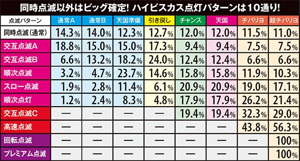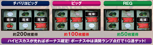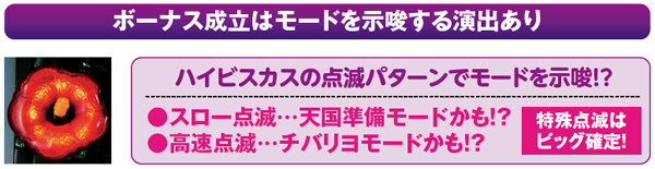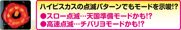 ボーナス当選時のハイビスカスのチカり方で滞在モードを示唆しているので必ず注目。高速点滅ならチバリヨモードの可能性が高まるので大連チャンに期待しよう。