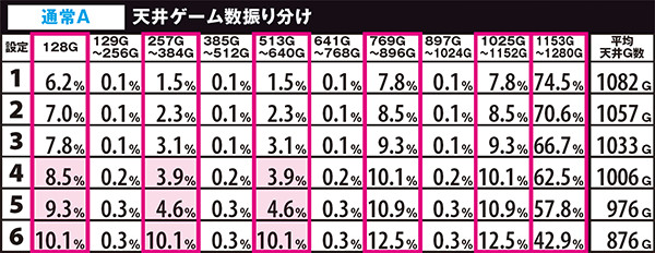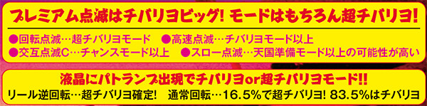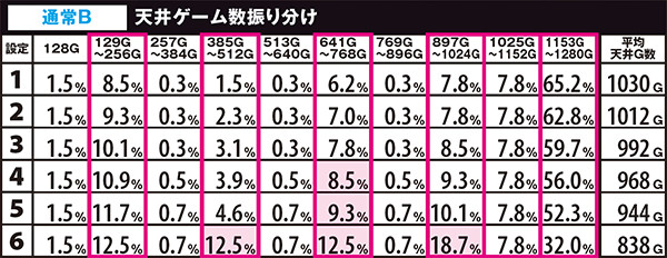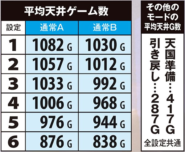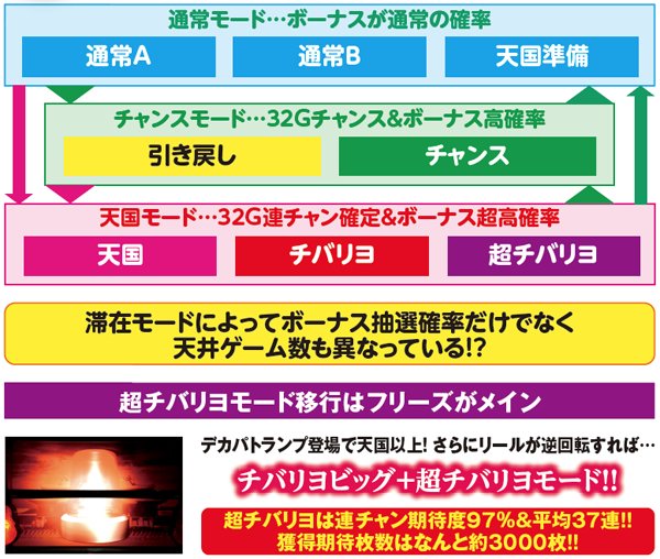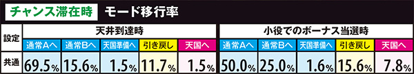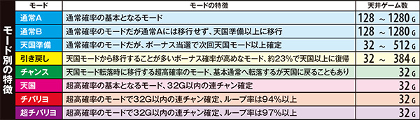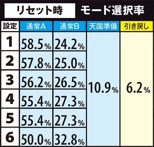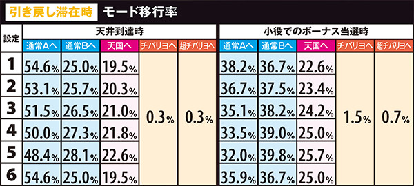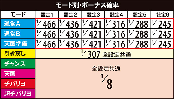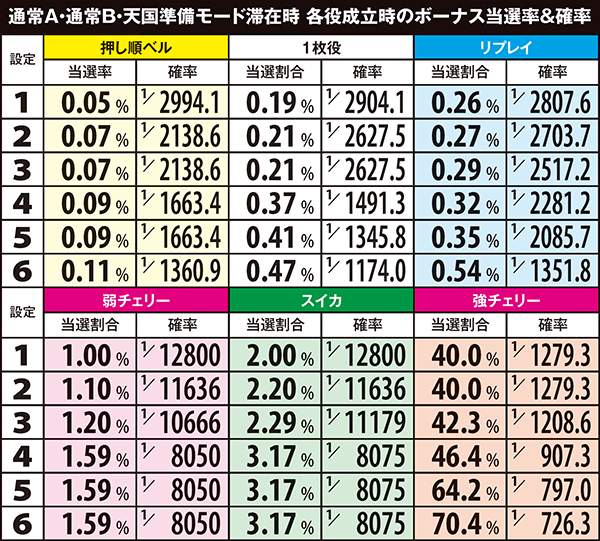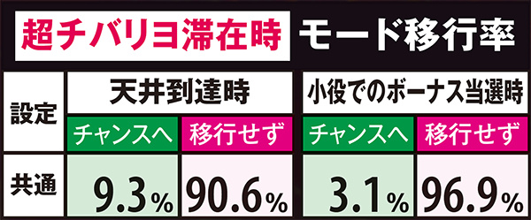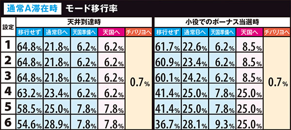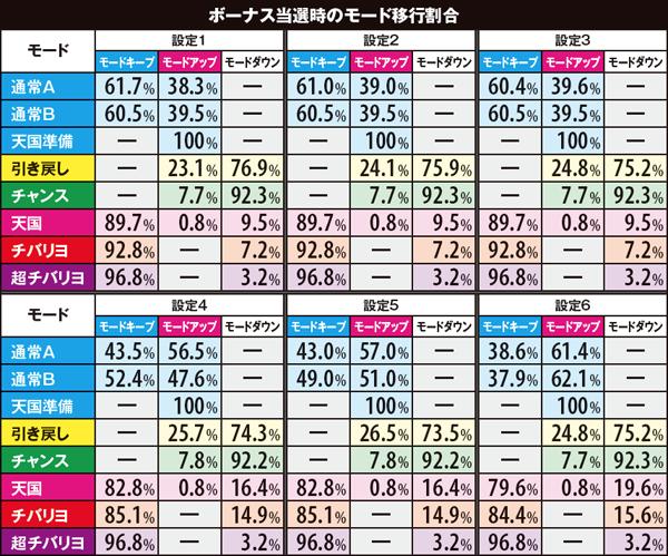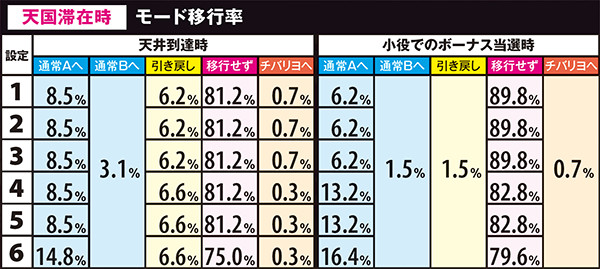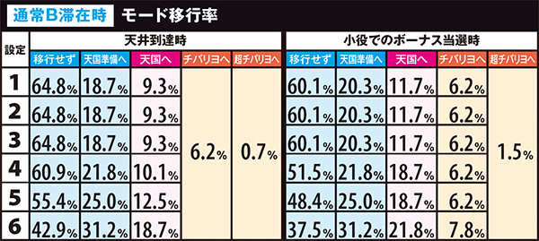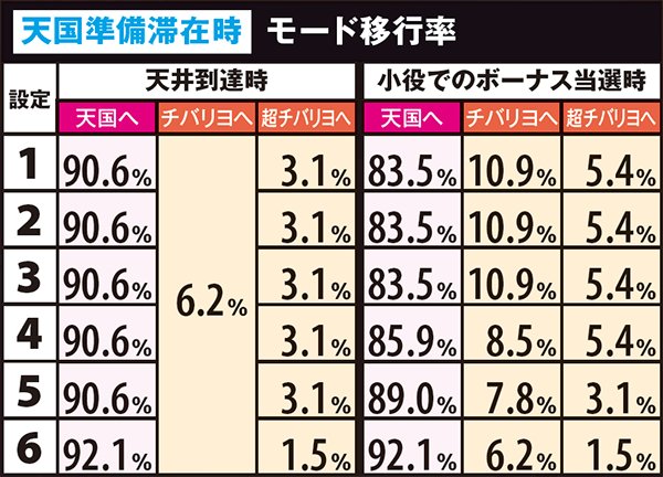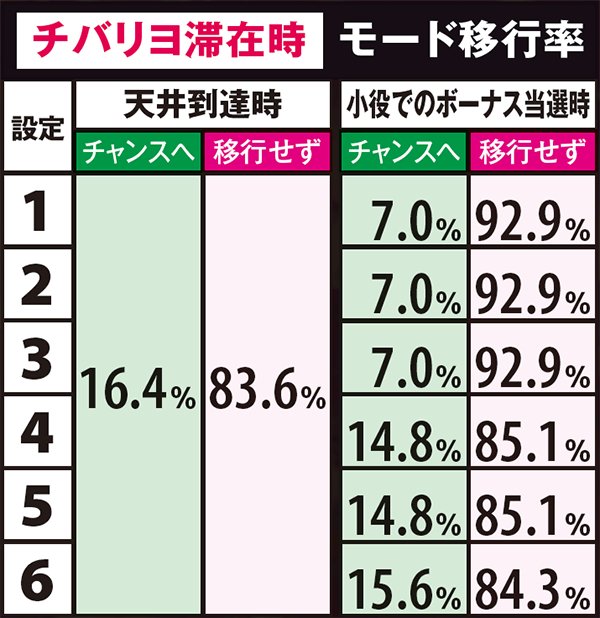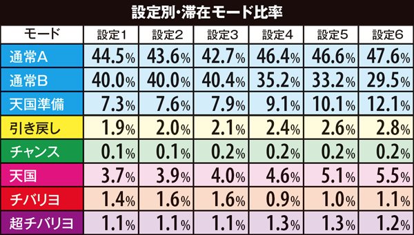 高設定域、特に設定6は上位モードへ移行しやすいので天国までの道のりが近いが、天国&チバリヨループ率は抑えられている。低設定域は通常A&Bでの同モードループ率が高く、上位モードへ移行しにくい。しかし天国&チバリヨに到達した暁には、小役当選時の同モードのループ率がかなり高いのでボーナスの大連チャンに期待できる。