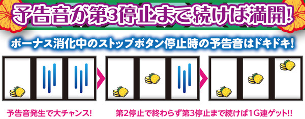ボーナス終了画面で上位モード滞在を示唆しており、夕暮れ時は32G以内の連チャンに期待しよう。また、告知時のハイビスカス点滅パターンにも注目。スロー点滅で32G以内に連チャンが発生しなくても天国準備の可能性があるので勝負続行か!?