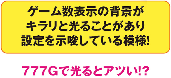 111Gや222Gなど、ゾロ目ゲーム数到達時はゲーム数表示に注目。設定を示唆しているようで、素直に考えれば奇数ゾロ目で光れば奇数設定、偶数なら偶数設定の可能性が高まりそうだ。