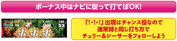 通常時&AT中の「!・!・!」ナビ発生時は、スタンダードなチェリー落としでプレイ。シーサーがスベッてきた場合のみ中リールにもシーサーをフォローしよう。シーサーは上段or右下がりで揃う可能性があるが、強弱はない。しっかりと目押しをしてシーサーがハズれたらリーチ目役だ。