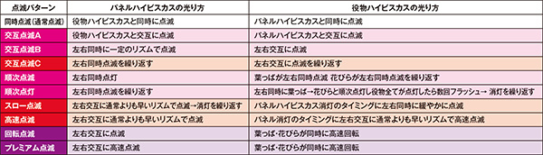 ※交互点滅A→役物・パネルハイビスカス交互点滅 交互点滅B→役物は同時点滅・パネルは左右交互に点滅。