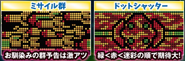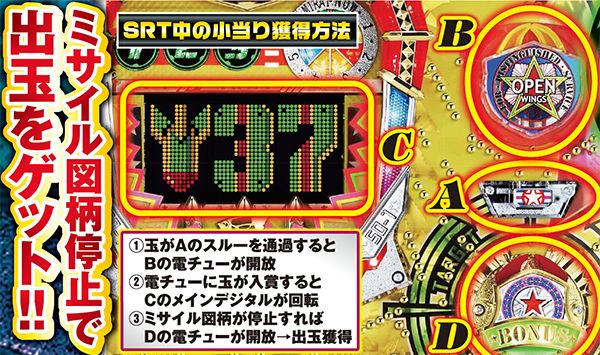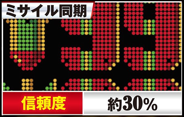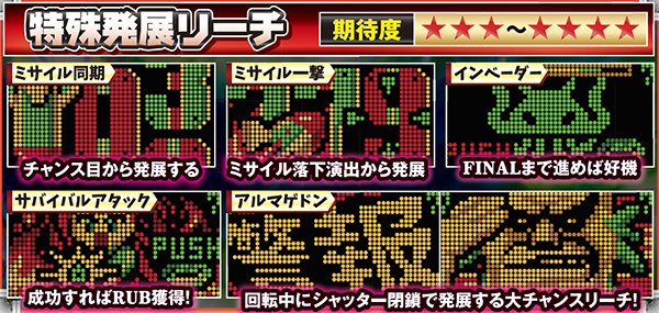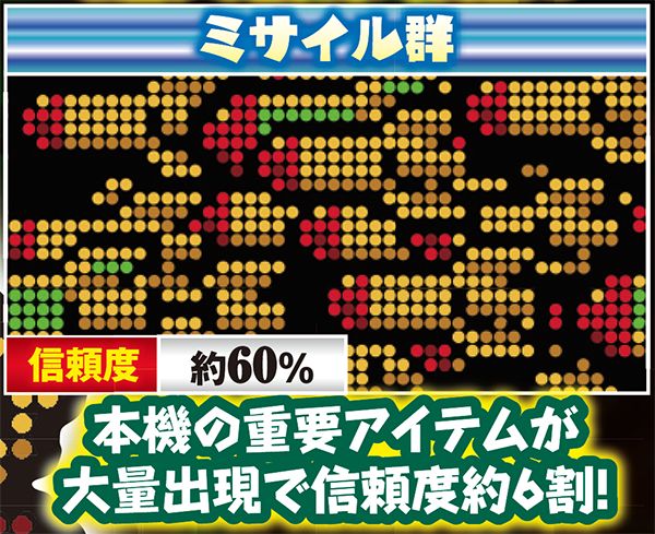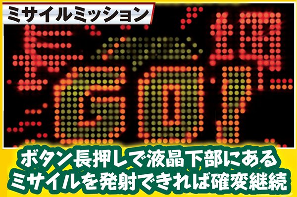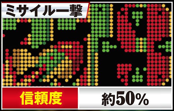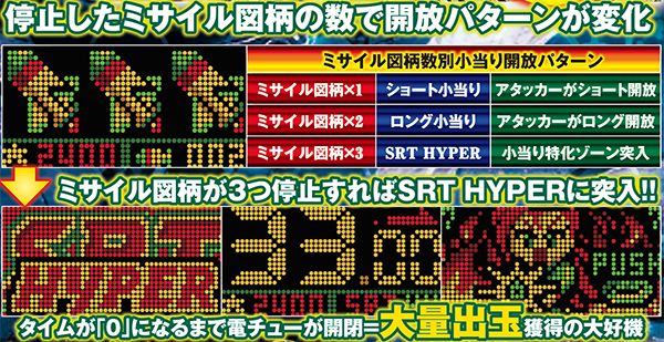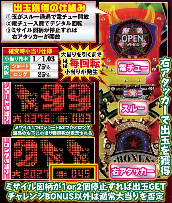 出玉増を強力にサポートするのは、ほぼ毎回転発生する小当りの存在。ミサイル図柄が1つでも止まれば小当りとなり、2つ停止すればアタッカーがロング開放する。3つ揃えばランクアップボーナスとなり、アタッカー開放時間は1.6秒&7カウントするか15開放で1R分となる。