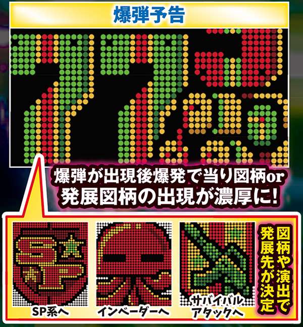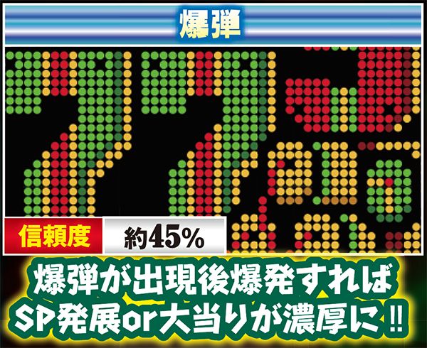出現後に爆発すれば当り図柄、又は発展図柄が停止する爆弾予告は大当りを導く重要な演出となっている。高信頼度SPへの発展を願おう。