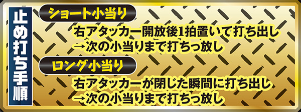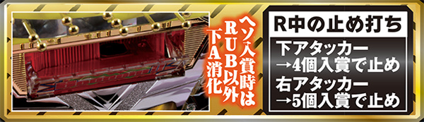 大当りは1ラウンド・7カウントで統一される。RUBだけは16秒の15開放or7カウントで1ラウンドとなり振り分け関係なく右アタッカー消化。その他は下4個、右で5個入賞後打ち出しを停止しよう。