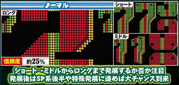 ノーマルリーチはショート、ミドル、ロングの3種類が存在し、大当りの大半がロング経由のスーパーリーチからとなっている。そのためロングまで発展するかがみどころとなり、その後停止する専用図柄により発展リーチが変化する。