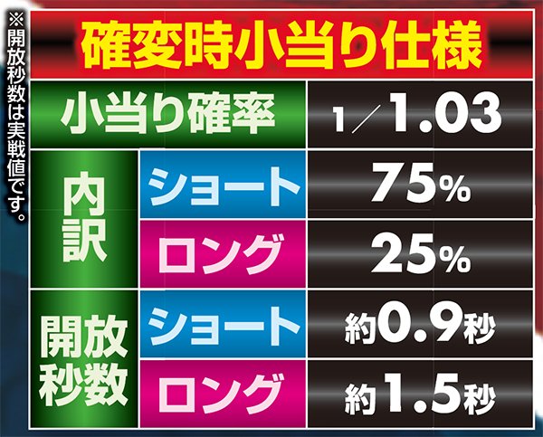 | 大当り確率 | 1/250.0(通常時) 1/40.32(高確率時) |
