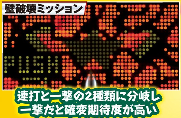 通常or確変のチャレンジBONUSにはミッションが3種類あり、いずれも成功で確変継続。壁破壊の連打は通常の大ピンチだが、一撃だと一転、成功期待度激高となる。