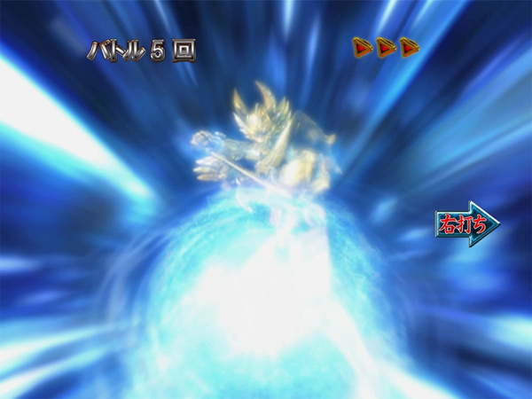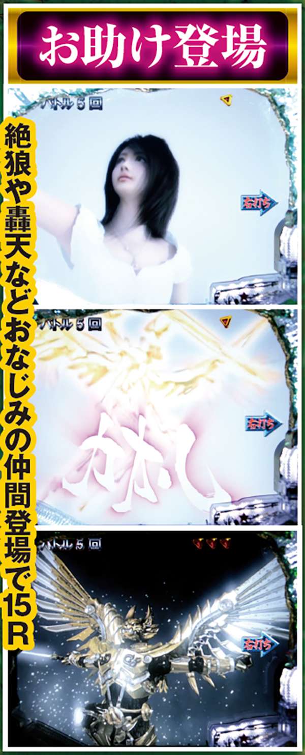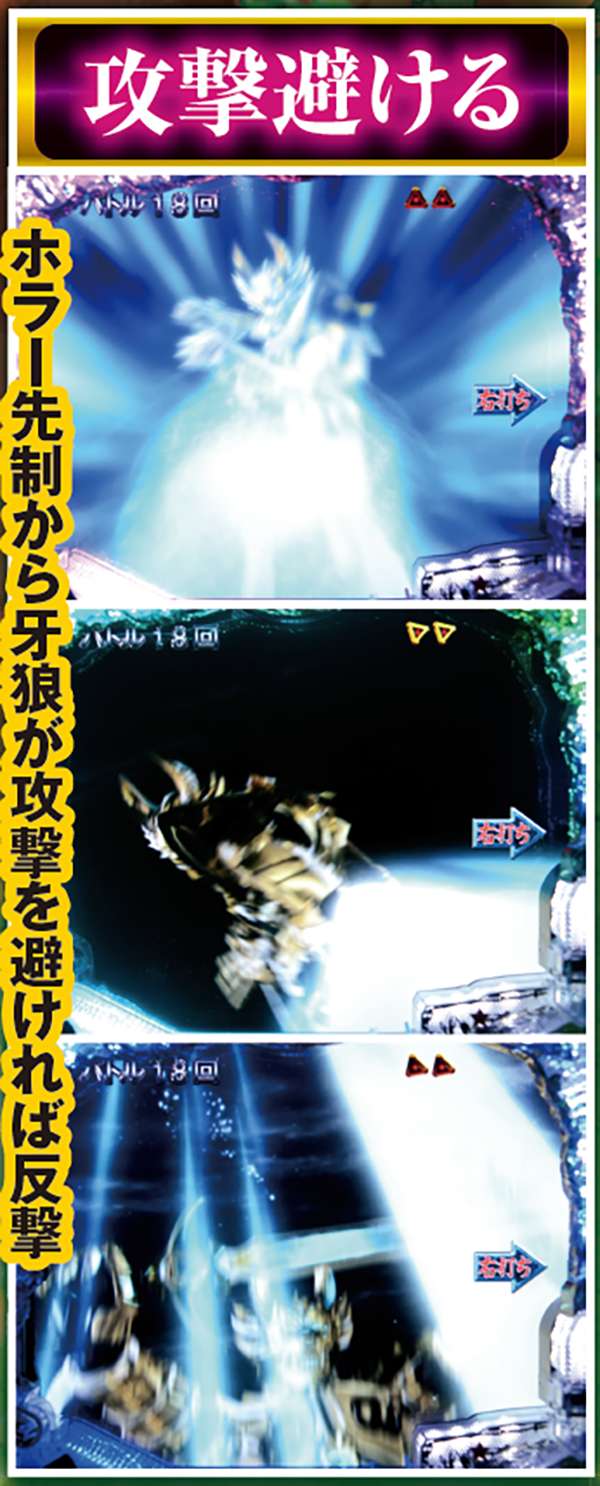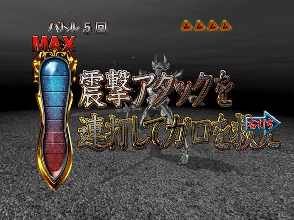 魔戒チャンス中は右打ちして役モノV入賞で大当りが発生。継続か否かはラウンド消化中のバトルに委ねられる。お助けや危機回避等、最終的に牙狼の攻撃発生で連チャン確定、さらに役モノ完成を伴えば15R大当り濃厚だ。なお、今作では4R大当りが発生する関係上、バトル勝敗は必ず4R消化時点で決着がつくことになる。