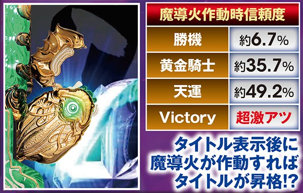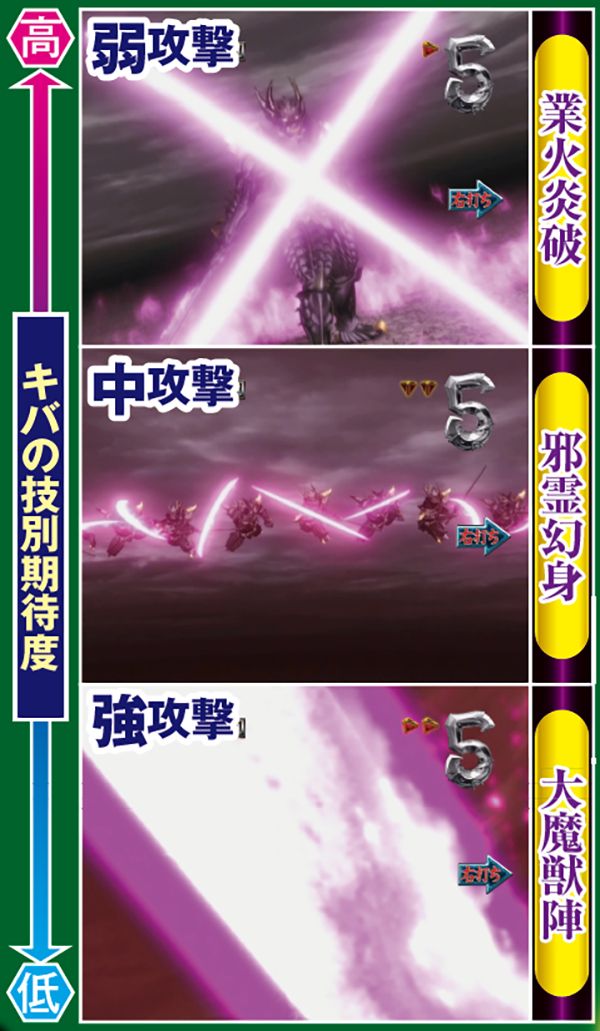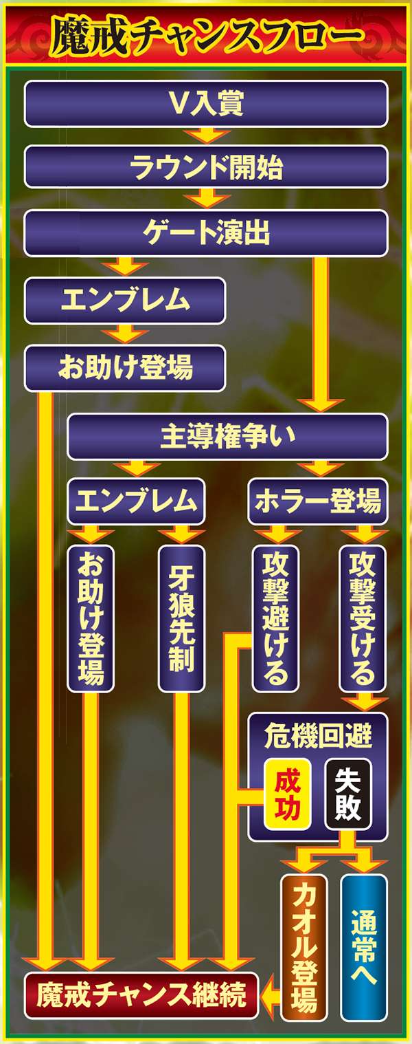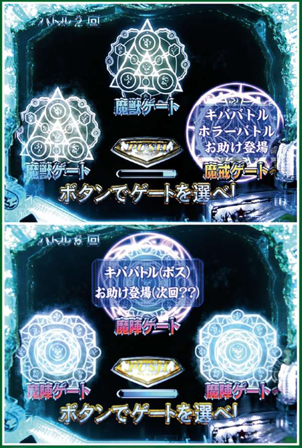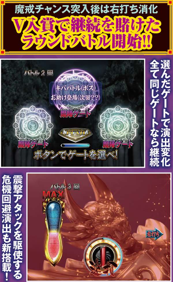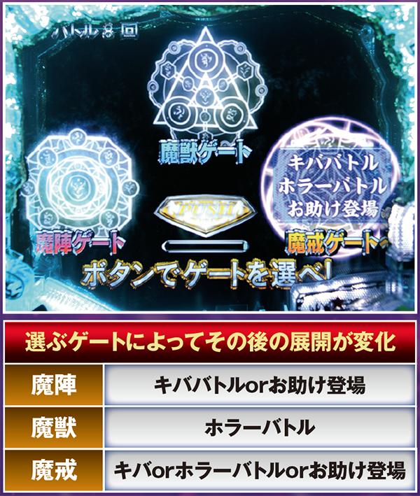 V入賞後はゲートにてバトル演出を選択。演出傾向として、結果が早く知りたいなら魔陣、バトルを堪能したいなら魔獣、魔戒はその中間となる。なお、もしゲートが全て同一なら…超歓喜の瞬間だ。