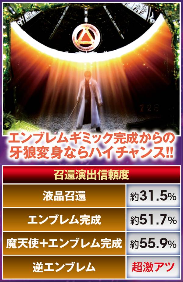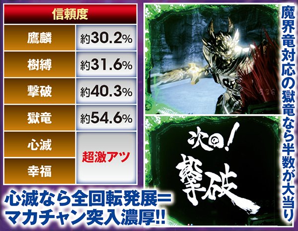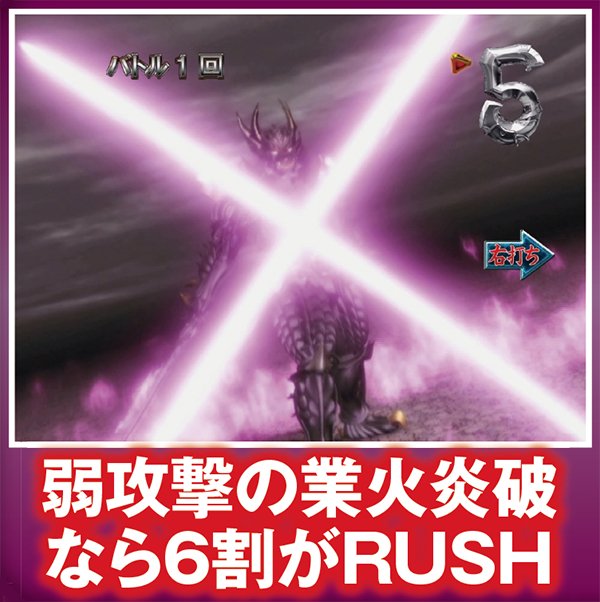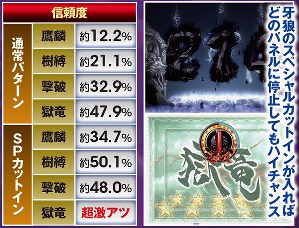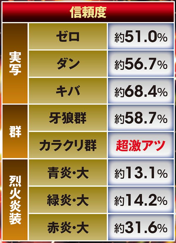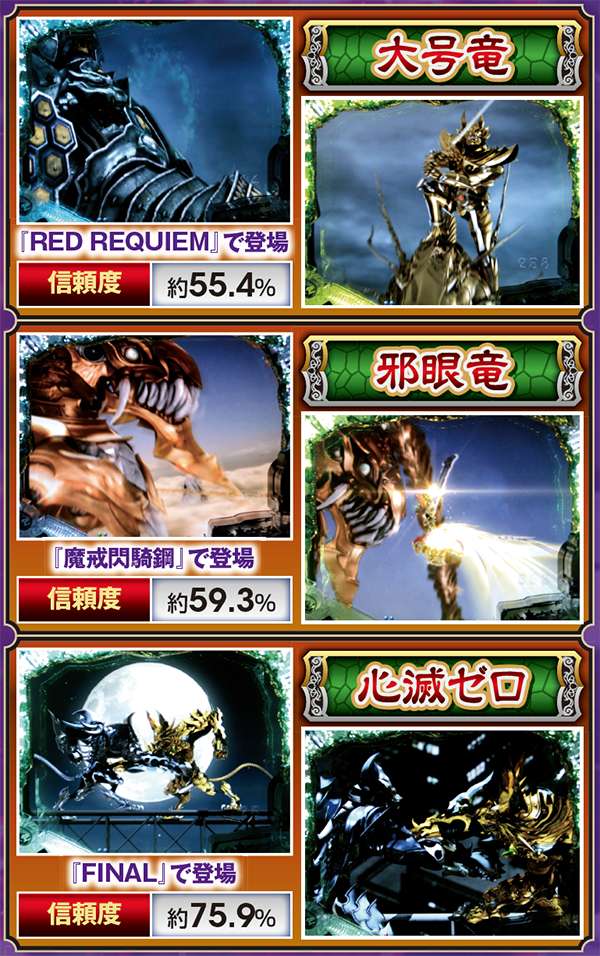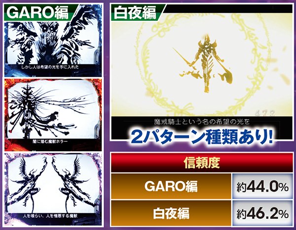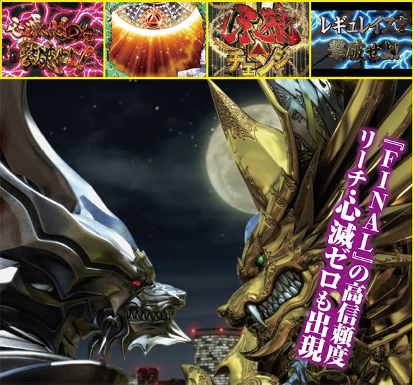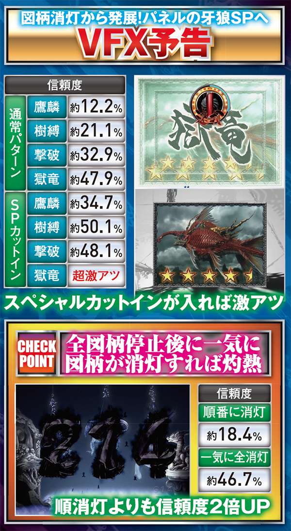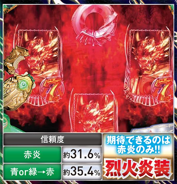 テンパイ直後の予告は、とりわけ実写と群に要注目。発生すれば牙狼SP発展濃厚&信頼度大幅アップとなる。烈火炎装は、炎が大ならチャンス。