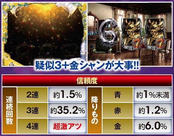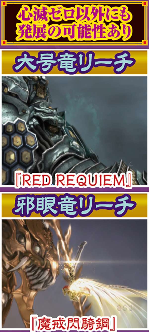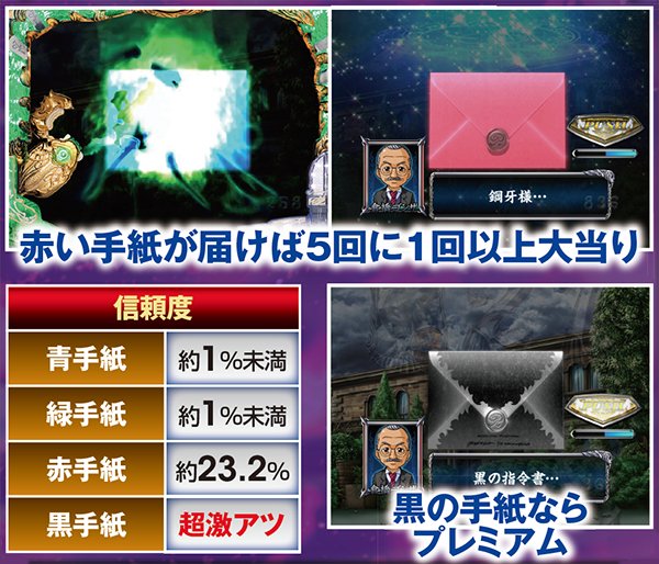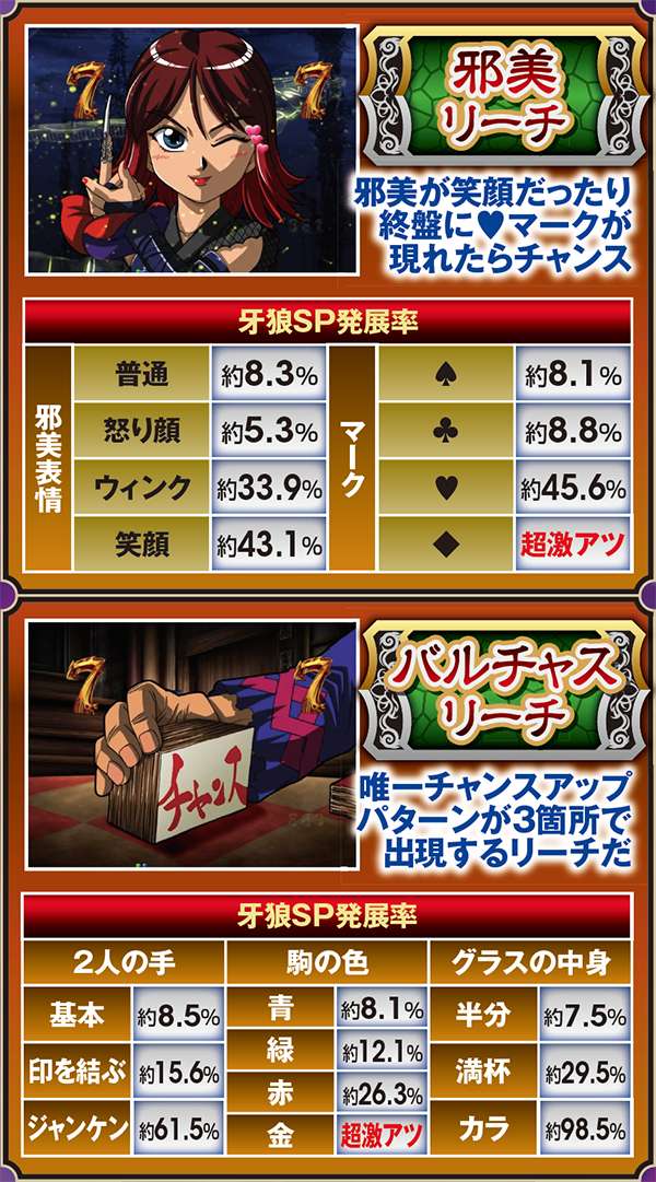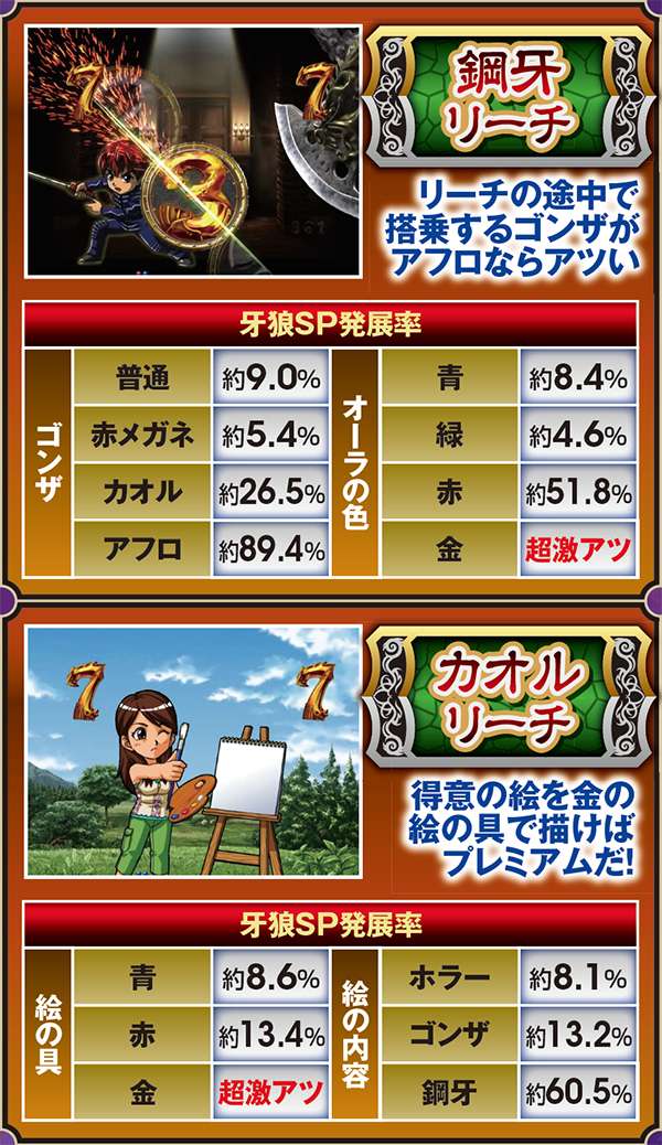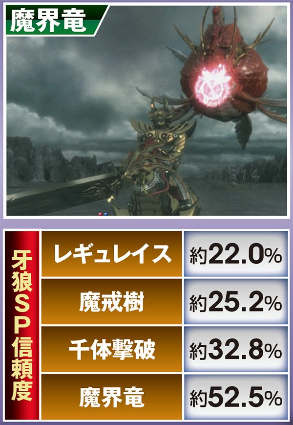 何れも信頼度は低く、ハズレ後の牙狼SP発展に期待。各チャンスアップは発展率に直結するため見逃し厳禁だ。もしキャラ系で直接大当りすれば…超歓喜!?