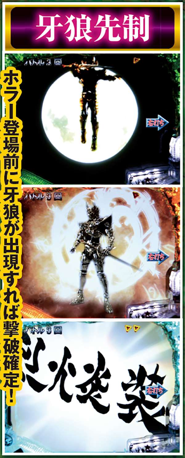 初当り後に発生する1stバトルでは、宿敵キバに勝利すれば魔戒チャンス突入となる。ここでは必ずキバの攻撃を喰らうが、攻撃の種類により危機回避の成功率が激変する。弱攻撃なら大チャンス!