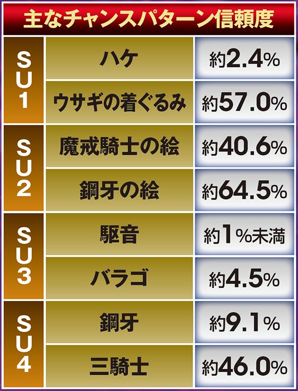 各段階毎に激アツパターンが用意されており、何れかの出現が大当りへの道標となる。疑似連継続中の昇格にも期待。