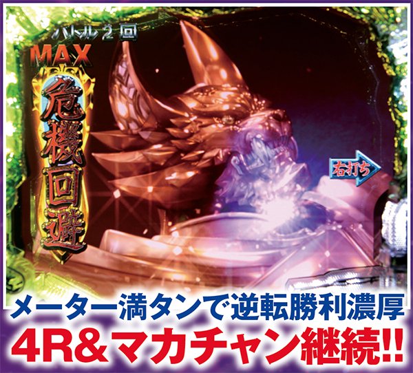 高い継続率にゲートやホラーなど多彩な法則性が組み合わさり、誰もが熱狂した魔戒チャンス中のあのラウンドバトルを完全再現。もちろん演出だけでなく基本仕様を見ても分かる通り、ライトミドルならマカチャン継続率は82%、当たれば半数が15Rと、爆裂遺伝子も継承されているのだ。