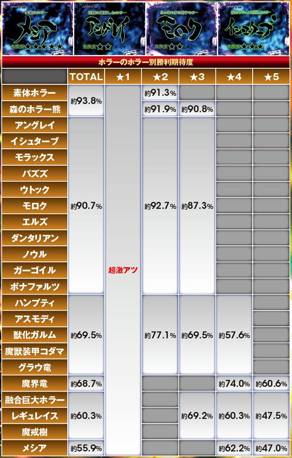 多彩な展開が堪能できるホラーバトルは、何より登場するホラーに要注目。さらに、同じホラーでも★の数が変化することで期待度も変化するのだ。なお、★1なら勝利濃厚だが、15R確定とはならない点に注意。