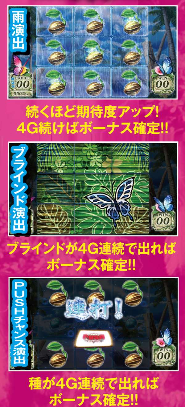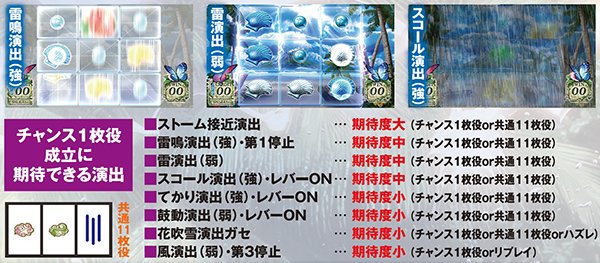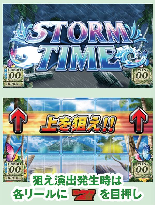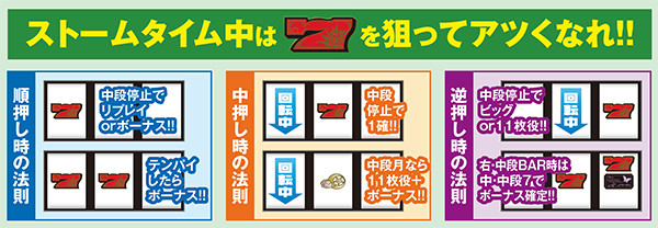 ボーナス後は例外なくストームタイムへ突入し、この間は高確率でボーナスに当選。ボーナスの当否は停止型から見極められ、中押し時は11枚役との重複も察知可能。なお、実戦上はストームタイム終了=ボーナス高確率状態も終了だ。