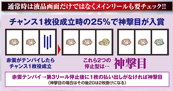 中段赤雲テンパイはチャンス1枚役成立で、その25%で神撃目が入賞。右リール停止パターンの4択となり、第3停止時に払い出しがなければ神撃目→天国モードへと移行する。払い出しを確認せずとも、神撃目入賞時は次ゲームからの2G間は2枚掛け→2枚が払い出される。