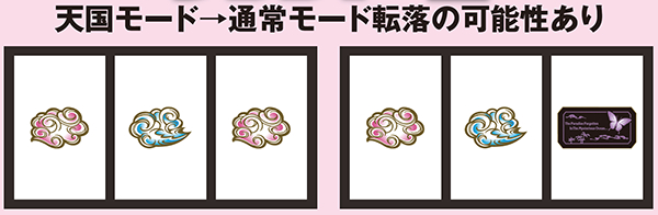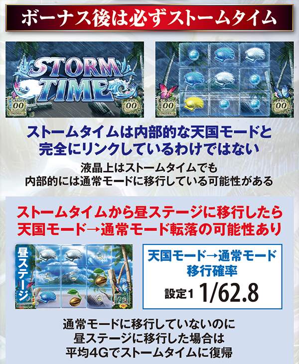 ボーナス後は必ず天国モードだが、ストームタイムから昼ステージに移行した場合は通常モード転落の可能性があり。実戦上、天国モード中はリプレイ出現率が下がっていると思われるので、ストームタイム滞在中であってもリプレイが頻出した場合は通常モード転落が濃厚だ。