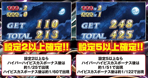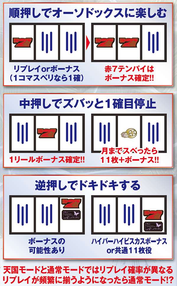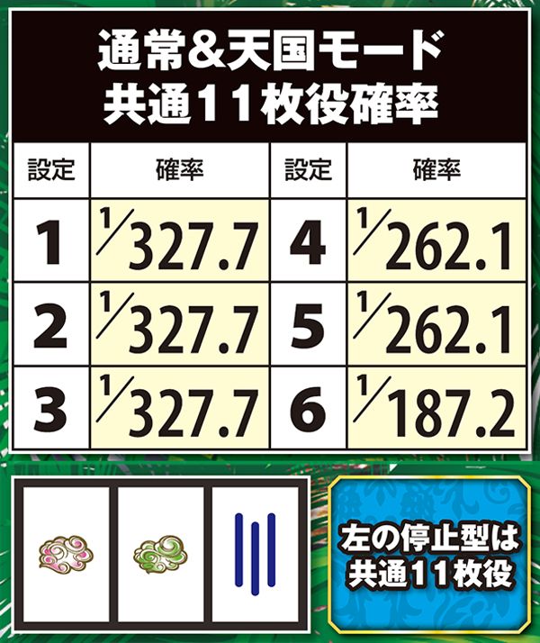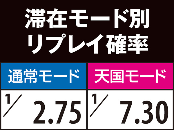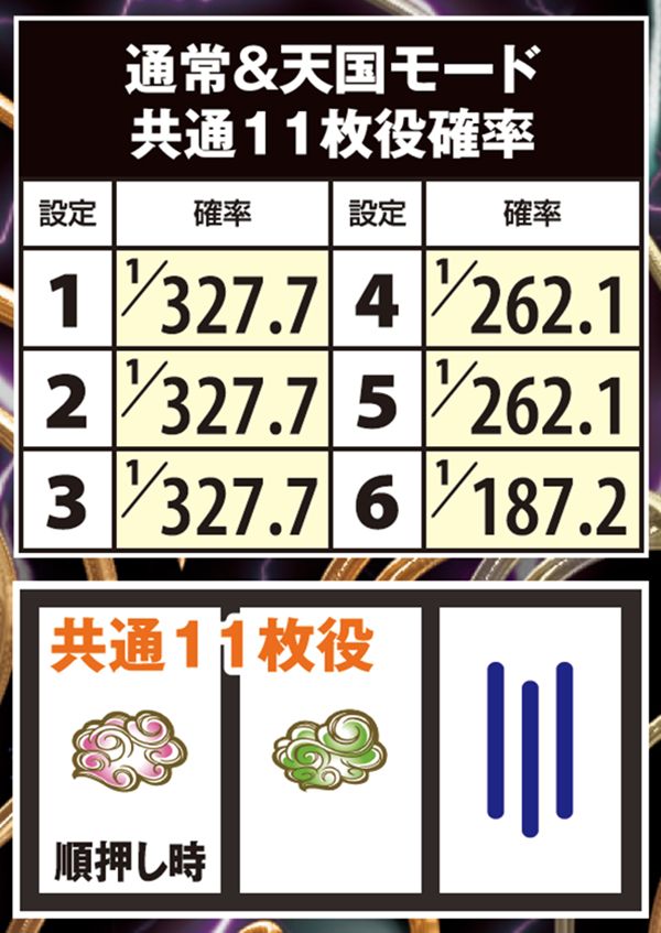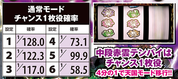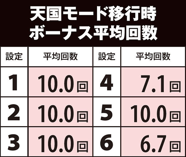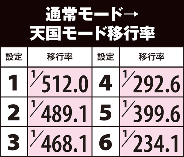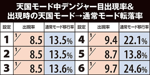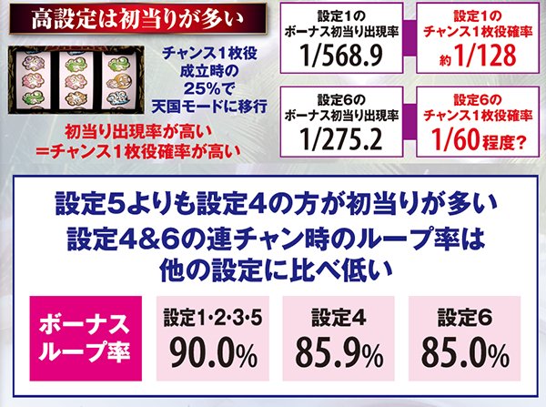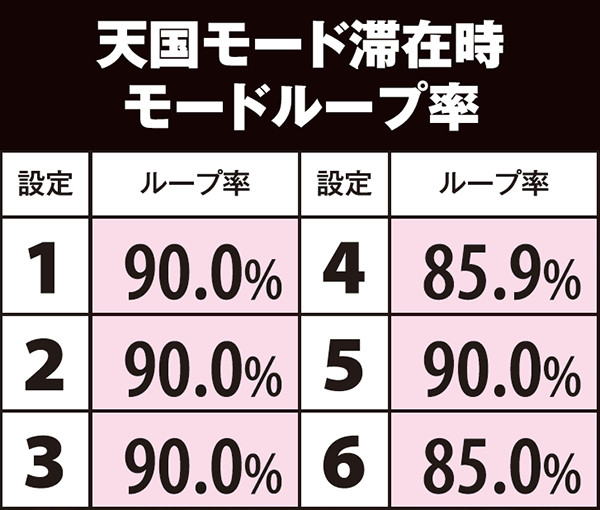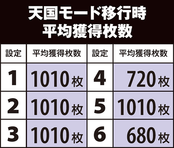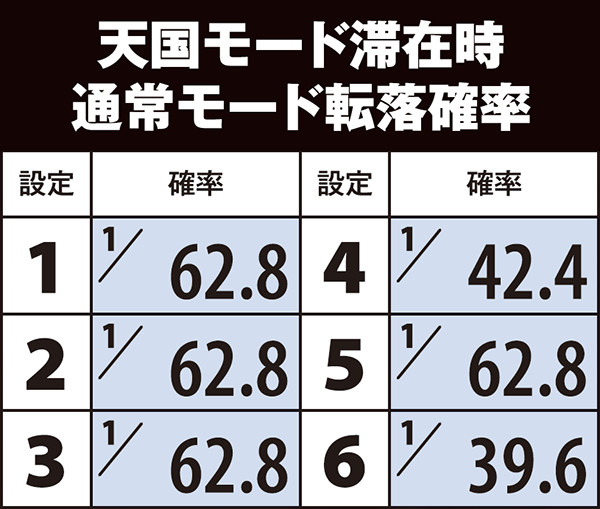天国モード滞在時における通常モード転落割合には設定差あり。設定4&6はその数値が高められているので、必然的にモードループ率もボーナス平均回数や平均獲得枚数も若干控えめとなる。チャンス1枚役が成立しやすい=天国モードへ移行しやすい設定4&6、はたまた連チャン期待度の高い設定5。どちらを望むかはプレイヤー次第だ。