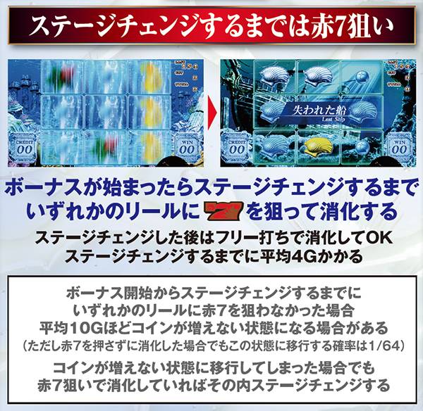 ボーナス開始後はステージチェンジするまでいづれかのリールに赤7を目押し。これを怠ると上記の通り平均10Gほどコインが増えない状態となり、時間効率が著しく悪くなる。必ず実践しよう。