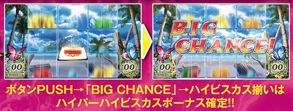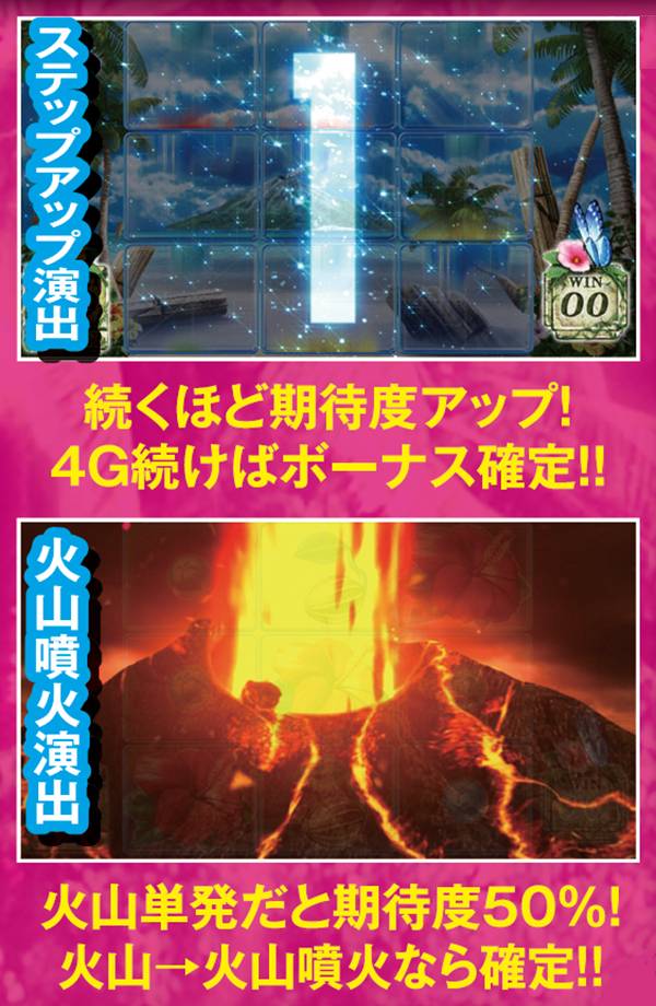 ズバ抜けた破壊力と単純明快なゲーム性で熱狂的ファンを生み出した「パチスロ ロストアイランド」。その後継機が、パチンコで出玉旋風を巻き起こした『ビッグドリーム』と合体。最強神となって舞い降りた。 連チャンの中枢を担うのが、ボーナス後に例外なく突入する「ストームタイム」。継続中はボーナス期待度が飛躍的に高まり、設定1でも約90%でボーナス当選、即ち連チャンが発生する。 |