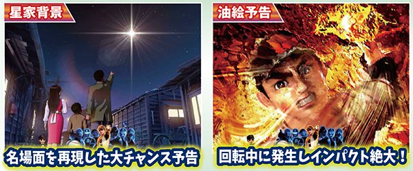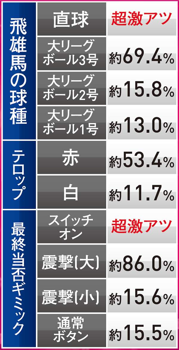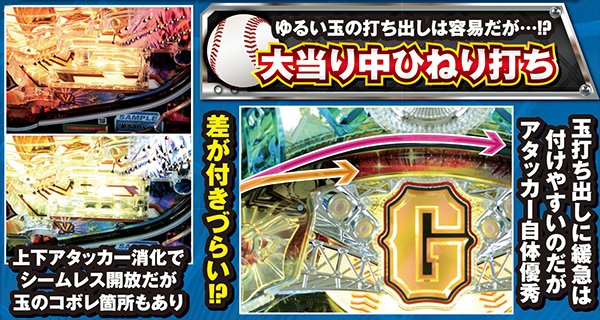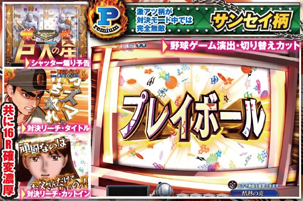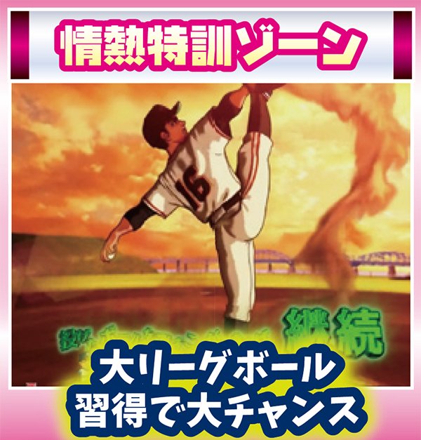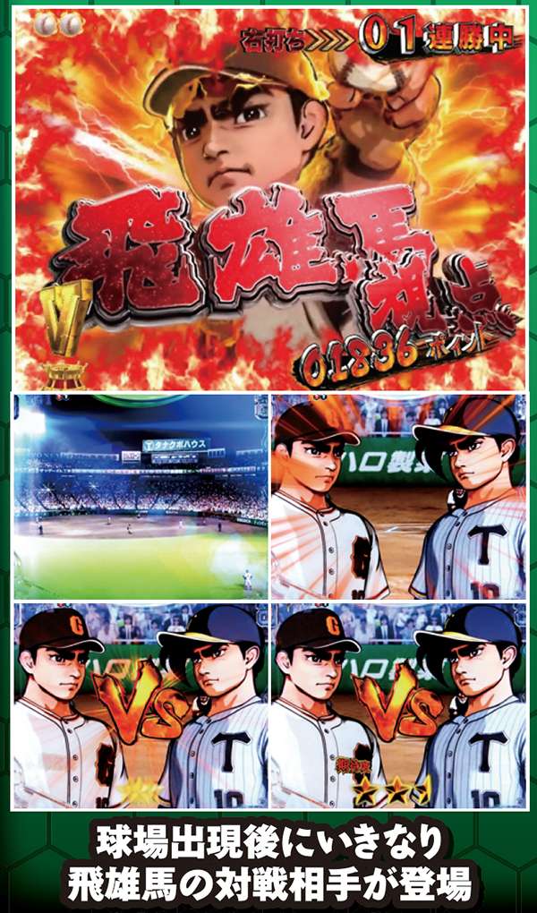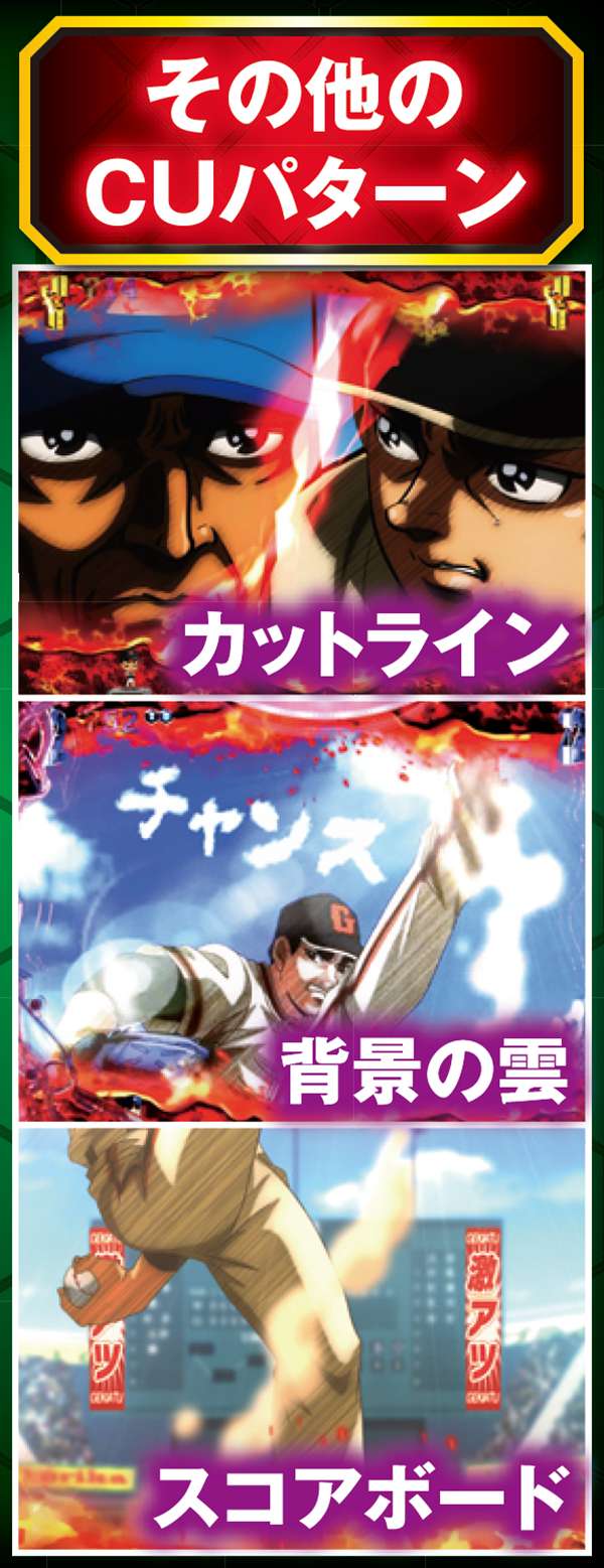 | 機種概要 | 200回転の超ロングSTを搭載して、野球漫画の金字塔「巨人の星」がホールに登板。右打ち中の大当りはすべて16Rと燃えるような試合が堪能できるぞ! |