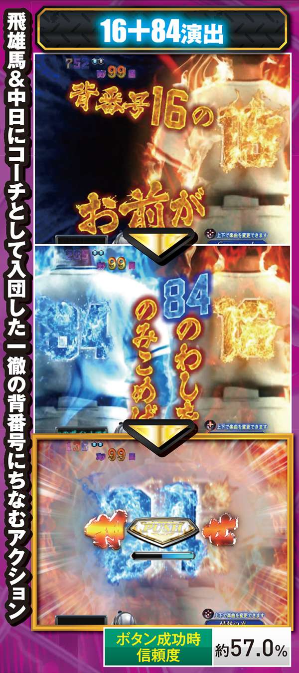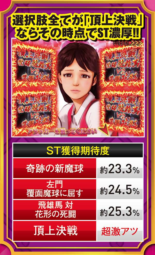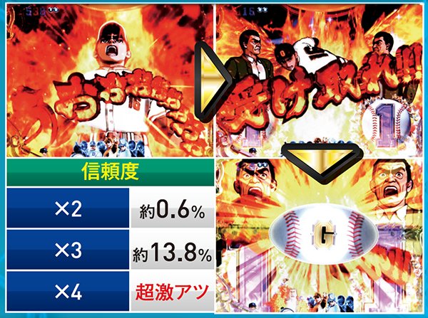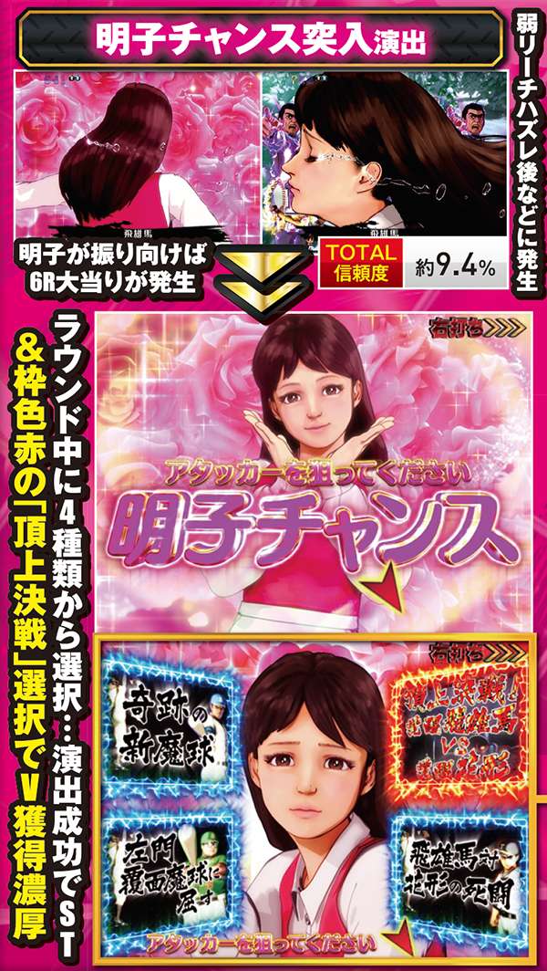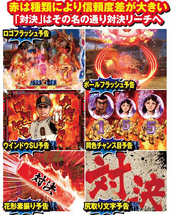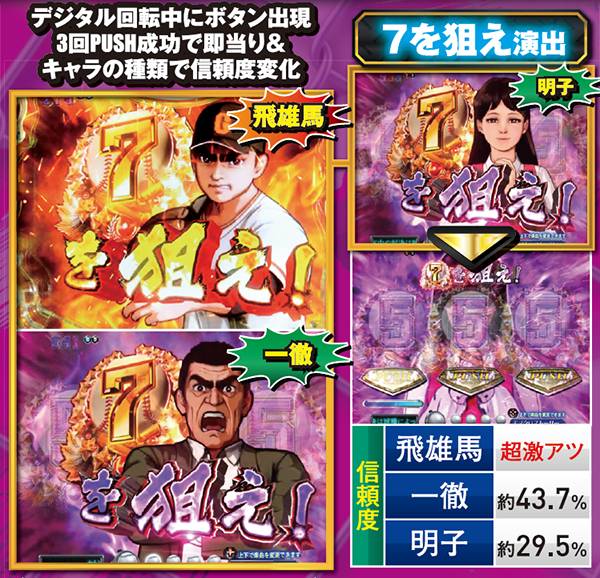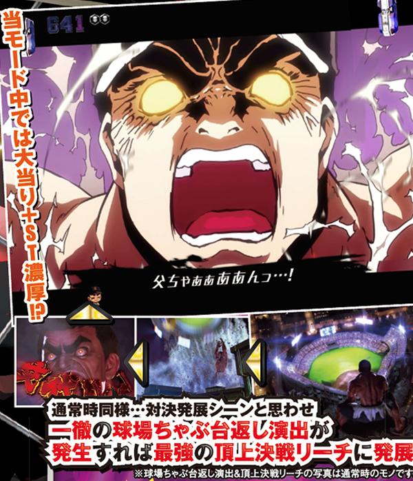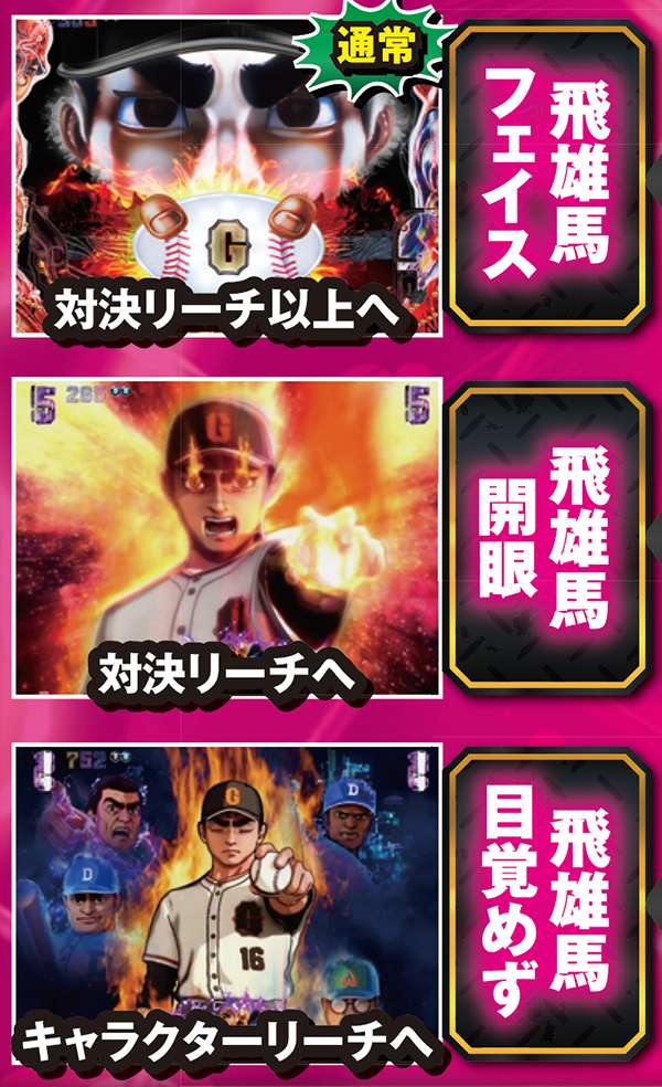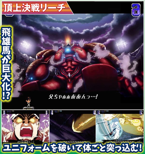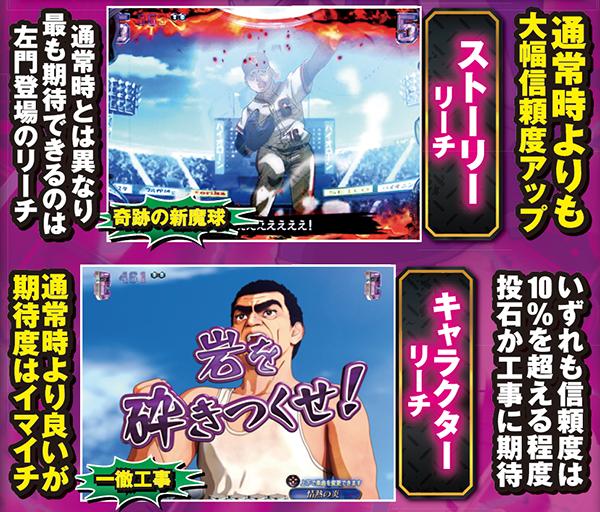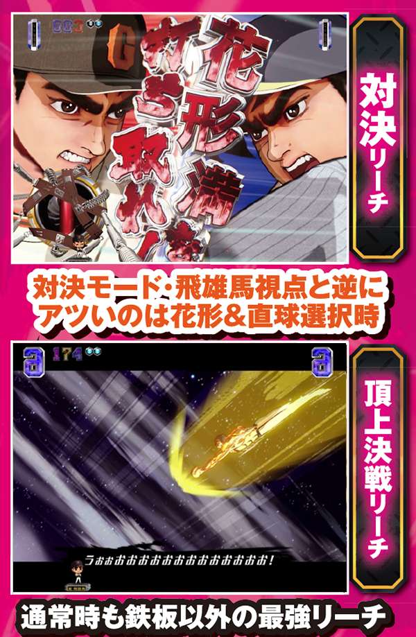 メインとなる対決リーチはCUが必須。出現箇所はST中の同リーチとほぼ同じだが、信頼度傾向が異なるので混同に注意しよう。また、飛雄馬と花形の死闘が繰り広げられる「頂上決戦」は信頼度約75%と本機最強クラスとなっている。