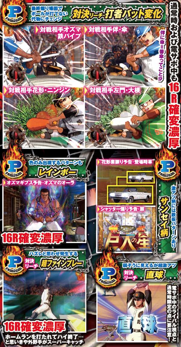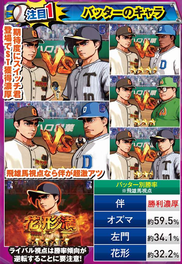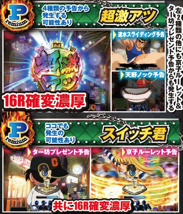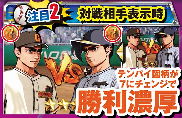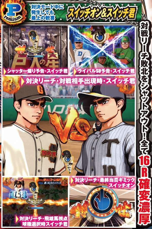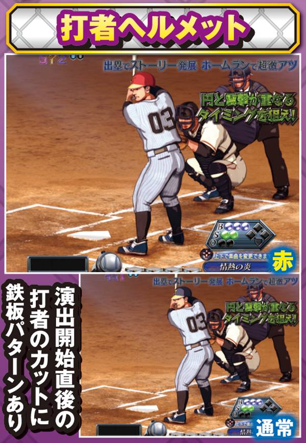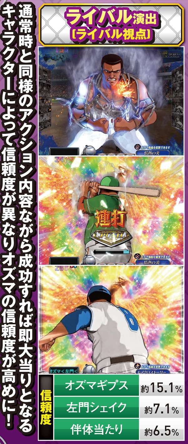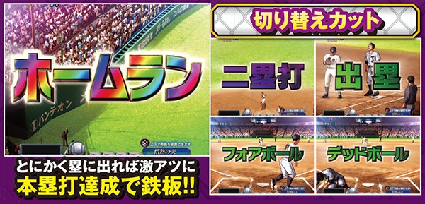 ライバル視点でのみ発生するプレイヤー参加型演出。基本的に出塁しただけで大チャンスとなっており、ホームランならその時点で大当り濃厚となる。また、打者のエフェクトや演出開始時の背景の色が赤なら激アツだ。