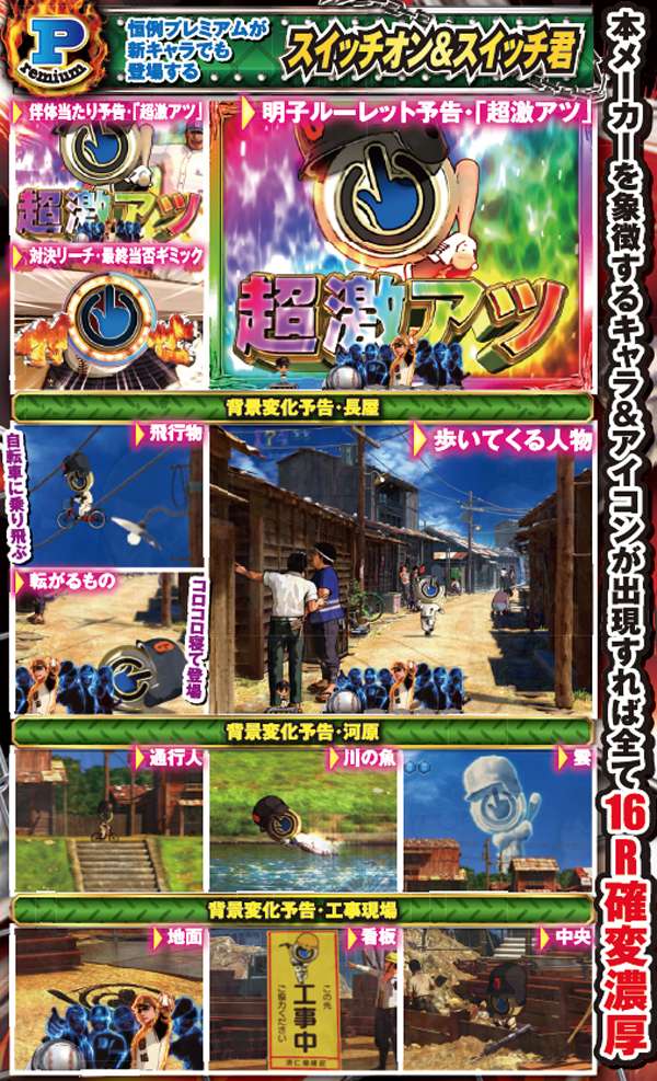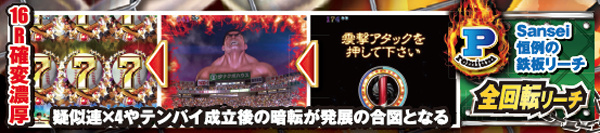 青図柄がテンパイした時点で16R大当りが濃厚となり、対決リーチへ発展する。演出中はチャンスアップパターンが豊富で、最後の最後まで白熱したバトルの行方は計り知れない。