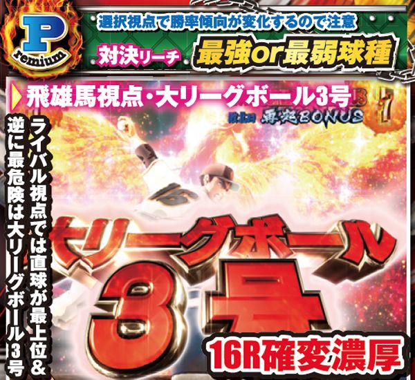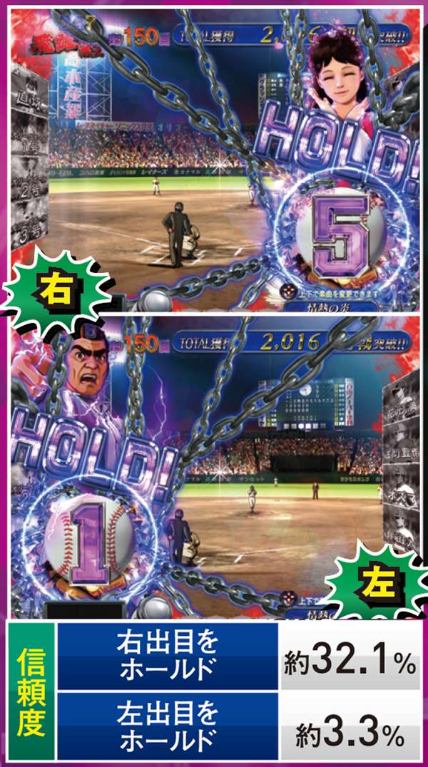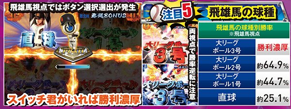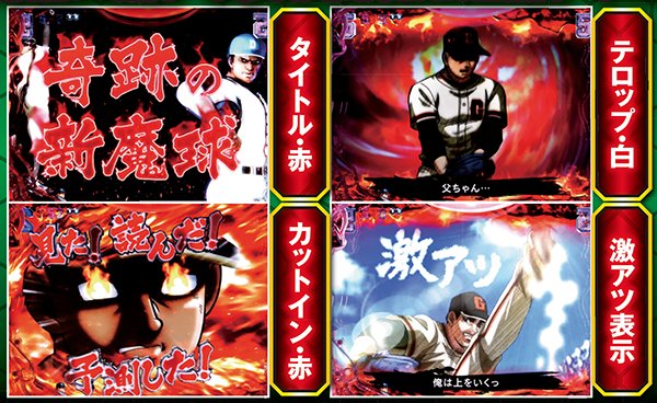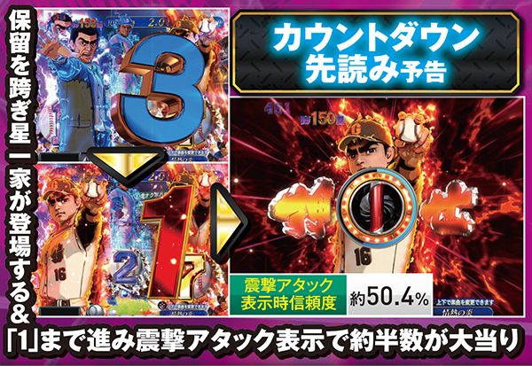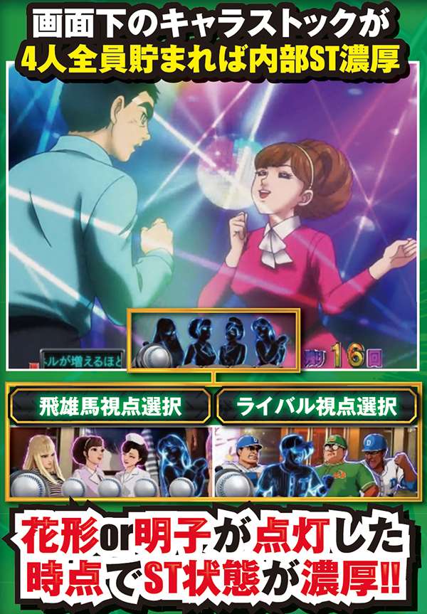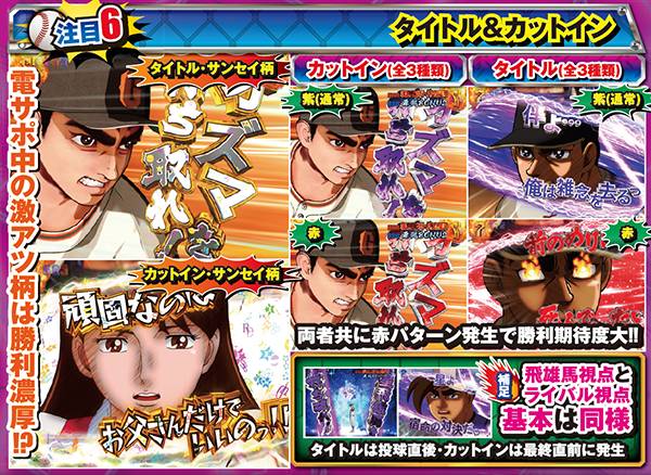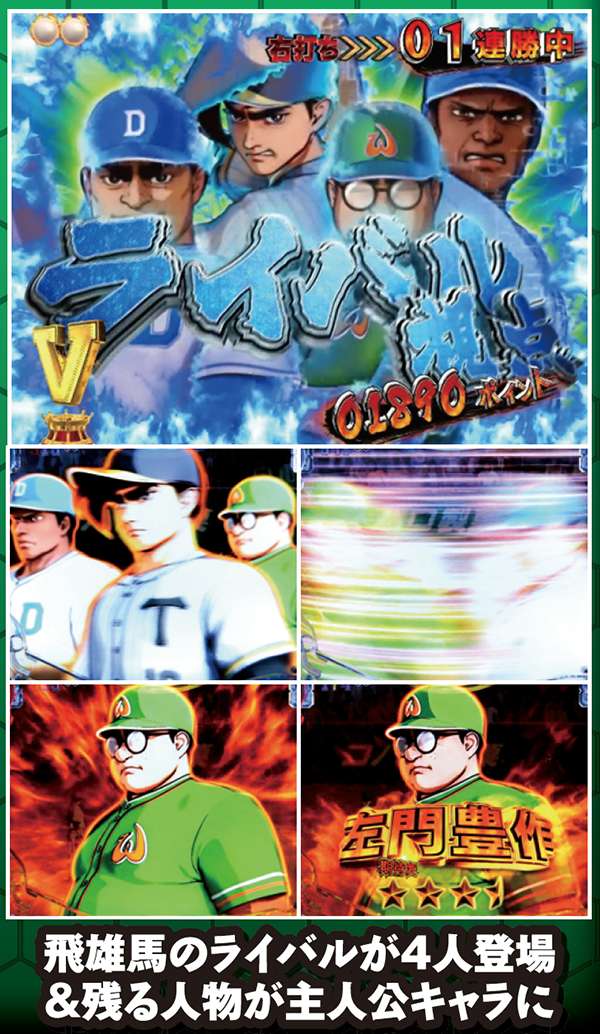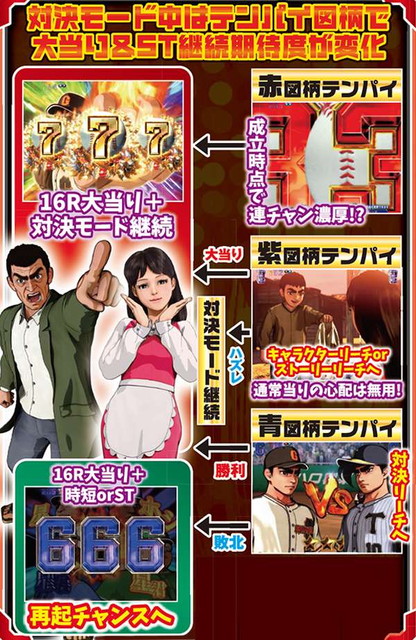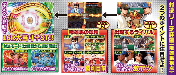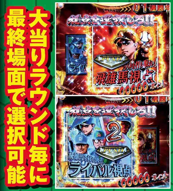 対決モード中予告や赤or青図柄テンパイで発展する対決リーチは、大当りラウンド中に任意で選択する視点によって、演出パターンが変化する。飛雄馬(投手)視点を選んだ場合は相手を打ち取ればST継続。逆に、ライバル(打者)視点なら飛雄馬からホームランを打てれば連チャン+STとなるのだ。