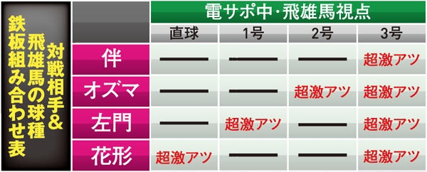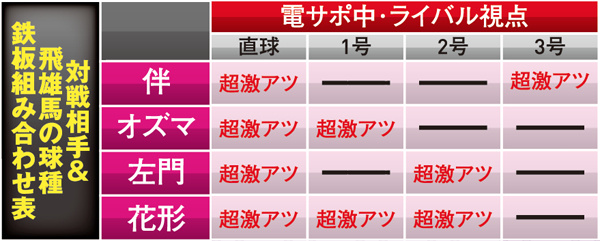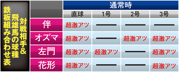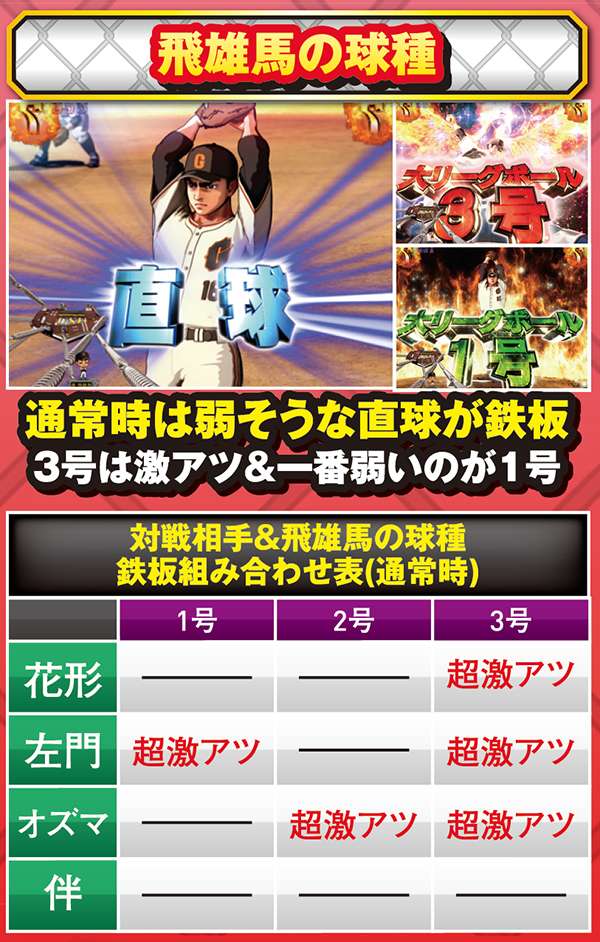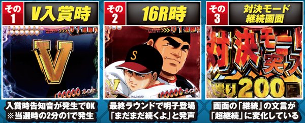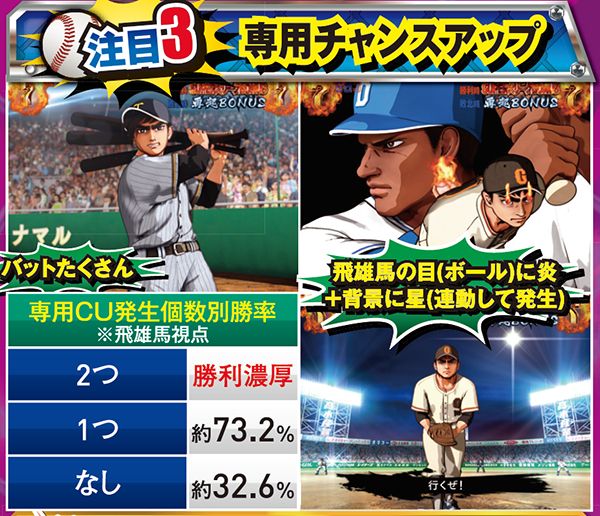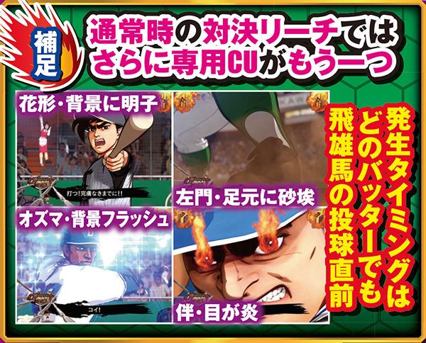 対決リーチで勝利するには多彩なCUの発生が必要不可欠となる。発生タイミングは通常時の同リーチとほぼ同様だが、 ST中(飛雄馬視点)の場合は打者が伴、球種は大リーグボール3号なら超激アツとなる。他にも専用CUの2つ複合やテロップ・赤なら大当り濃厚となる。