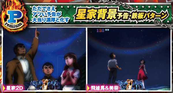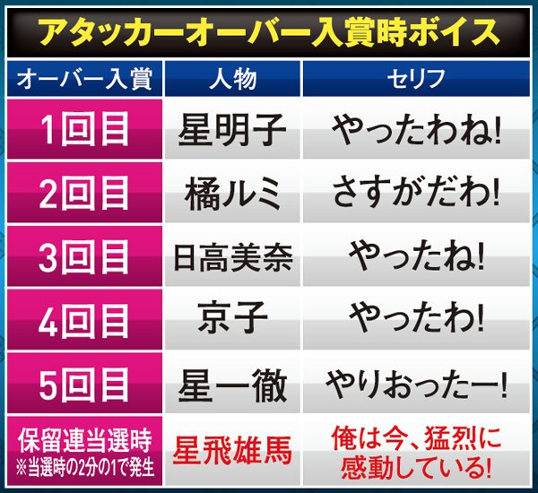 オーバー入賞が成功するとキャラクターのボイスが発生し、成功回数によって発生する人物が変化していく。出現しにくいが飛雄馬のボイスになれば保留連が濃厚になるのだ。