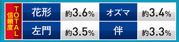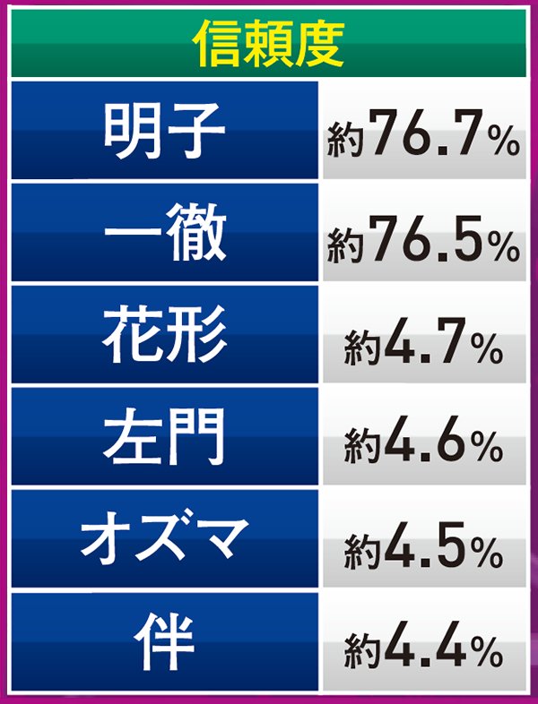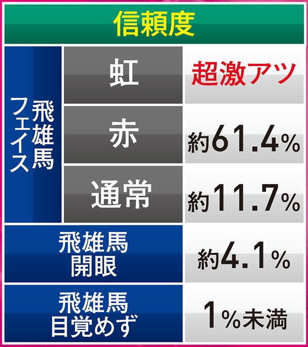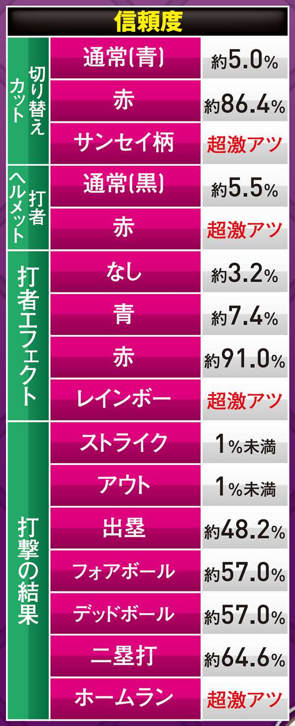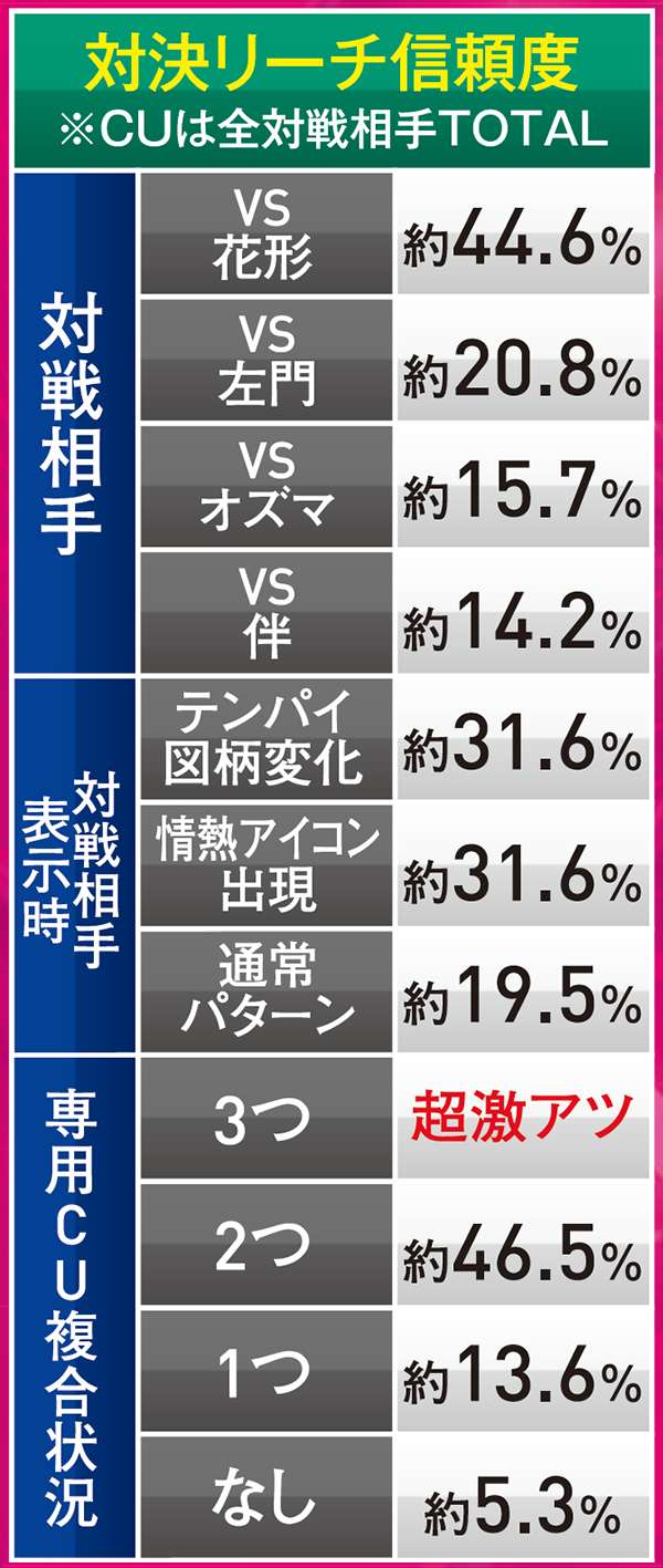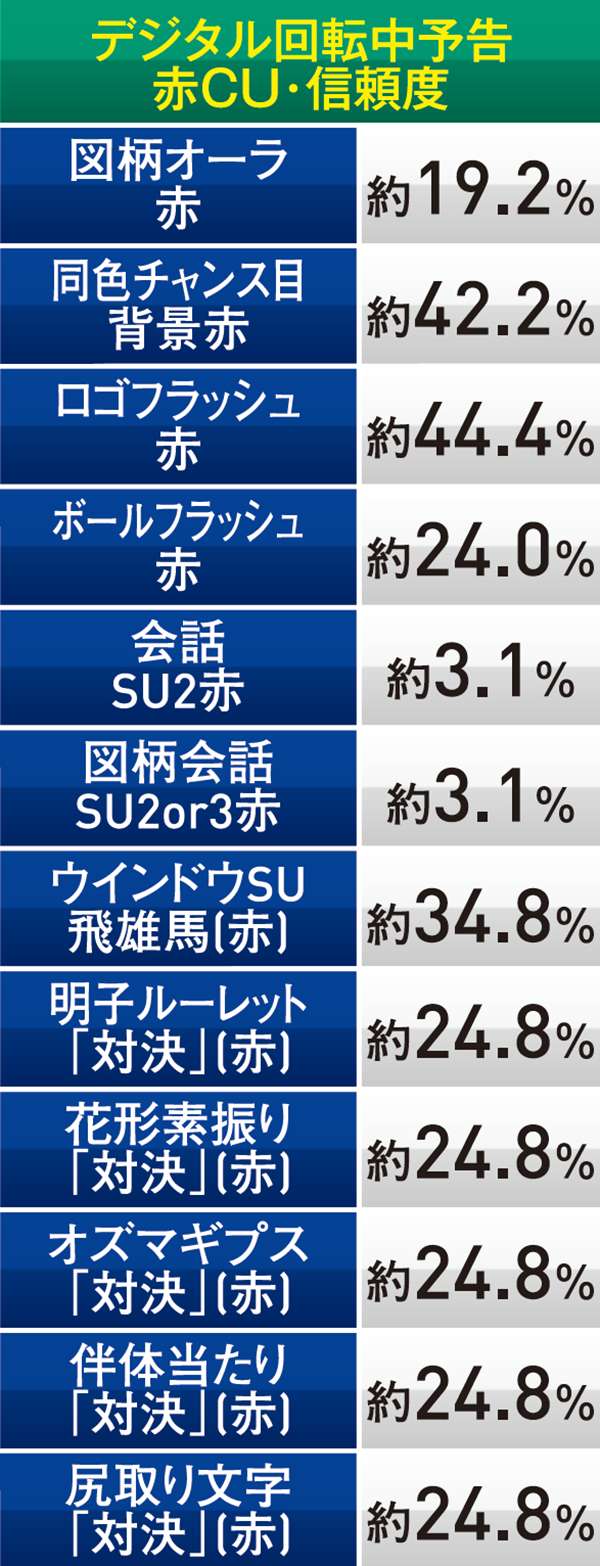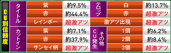トータル信頼度は総じて低いものの、赤系のCUが絡めば信頼度は約40%近くまで跳ね上がるので期待しよう。頂上決戦と同じく、こちらも当たれば確変が約束されるぞ。