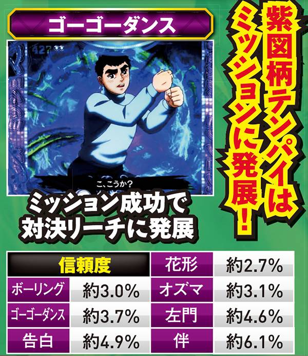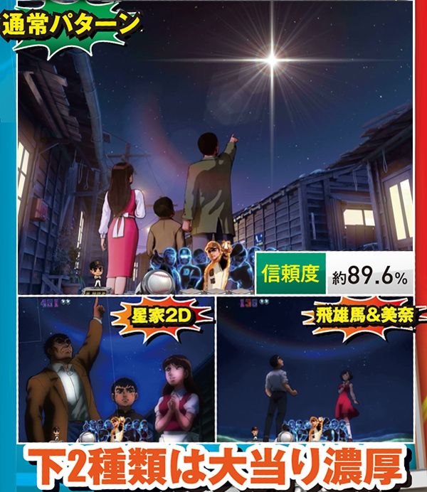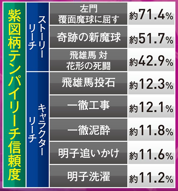 紫図柄テンパイは、キャラクターorストーリーに発展する。前者は軒並み期待薄だが、後者なら最低でも約42%の信頼度を誇るので是非発展を望みたい。