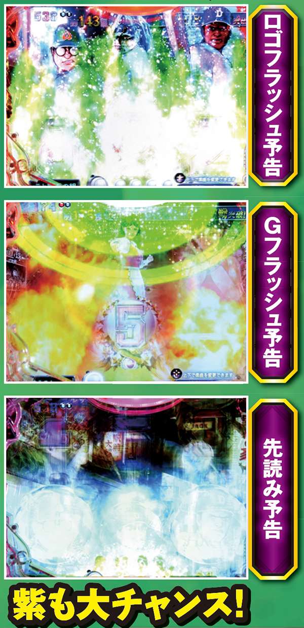 通常時に発生すれば最も期待できるのがこの3演出。発生時は「PROJECT TK」等と同様で、枠上の天ランプが光ると共にけたたましい音が鳴り響く為、分かりやすい。