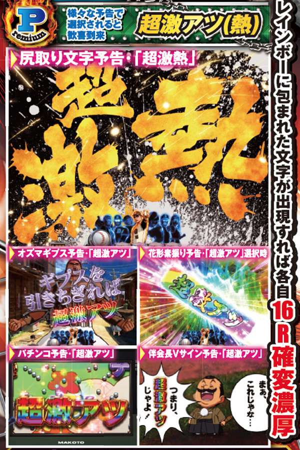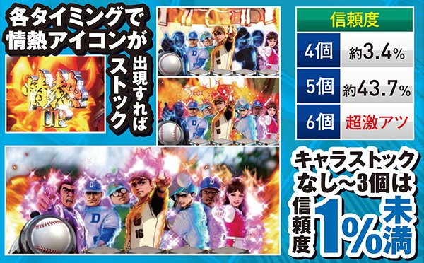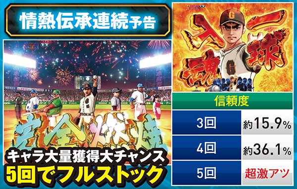 情熱アイコンが出現すれば画面下のキャラクターが点灯し、5個以上貯まれば好機到来。発生箇所は疑似連やリーチ中など多彩となっているぞ。さらも情熱伝承連続予告が発生すれば大量ストック獲得の大チャンスだ。